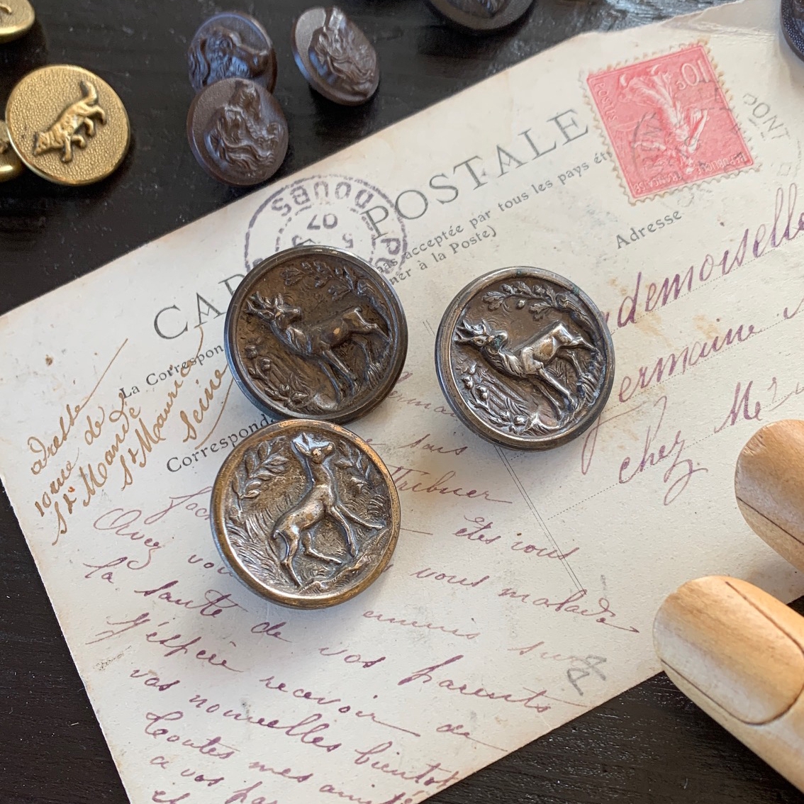 フランス 19世紀後期 鹿 牡鹿 真鍮 ボタン φ21mm ハンティング ジャケット ジビエ 焚き火 ヴィンテージ 古着 アンティーク 2 收藏