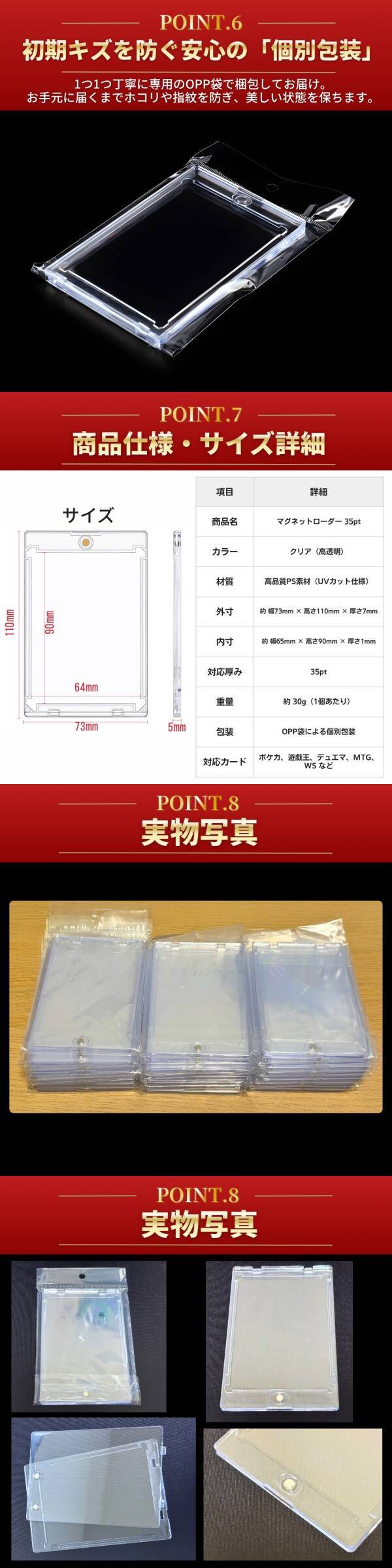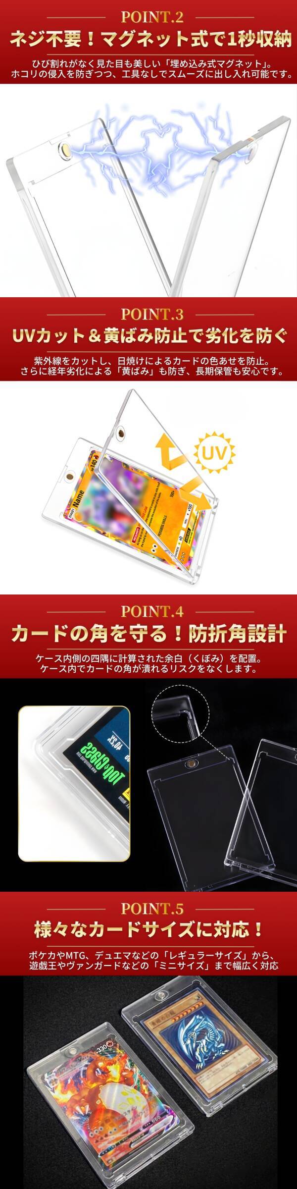 【商品の魅力】 ◆ 黄ばみにくい高品質PS素材 透明度が高く、経年劣化による黄ばみが発生しにくい優良素材を採用。大切なカードをいつまでも美しくディスプレイできます。 ◆ 徹底した角折れ防止設計 内側の四隅にスペース(くぼみ)を設けることで、カードの角へのダメージを完全に防ぎます。 ◆ マグネット式で出し入れ簡単 ネジ式のスクリューダウンのような手間は一切不要!強力マグネットでピタッと閉まり、スムーズにカードの入れ替えが可能です。 ◆ 嬉しい個別包装 1つ1つOPP袋で個別包装されているため、お届け時や保管時の指紋・擦り傷を防止します。 【商品仕様】 ・サイズ(外寸):約 幅73mm × 高さ110mm × 厚さ7mm ・サイズ(内寸):約 幅65mm × 高さ90mm × 厚さ1mm(35pt対応) ・カラー:クリア(透明) ・材質:高品質PS(ポリスチレン) ※遊戯王、ポケモンカード(ポケカ)、デュエルマスターズ、MTG、ヴァイスシュヴァルツなど、一般的なミニサイズ~レギュラーサイズのカードに対応しています。(インナースリーブに入れた状態でも収納可能です) |