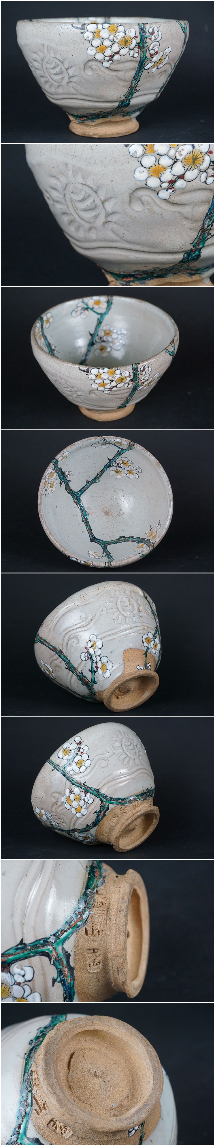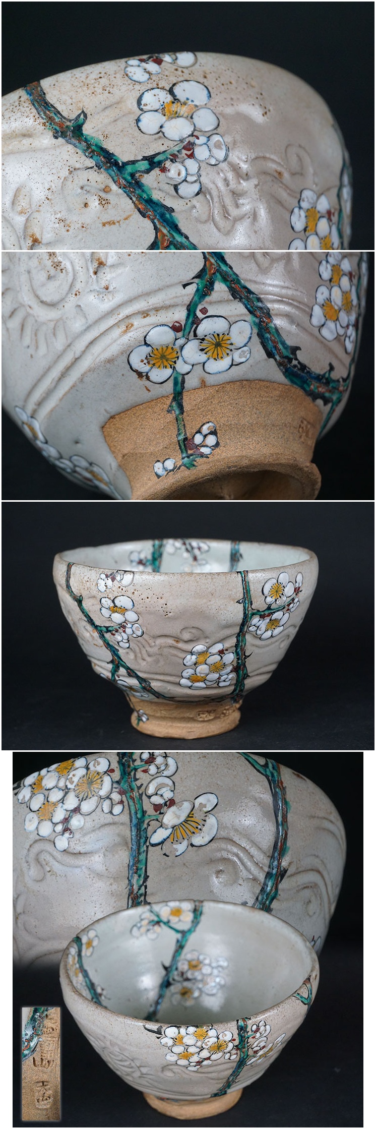 | 赤膚山の茶碗です。 梅の枝部分は傷?漆塗りで修理をした後、 絵付けされた物?か、変わった絵付けが施されています。 経緯等不明です。画像ご参考の上ご入札ください。 重さ342g 口径12.8~12.9cm 高さ9.3cm 高台径5.4cm | |||