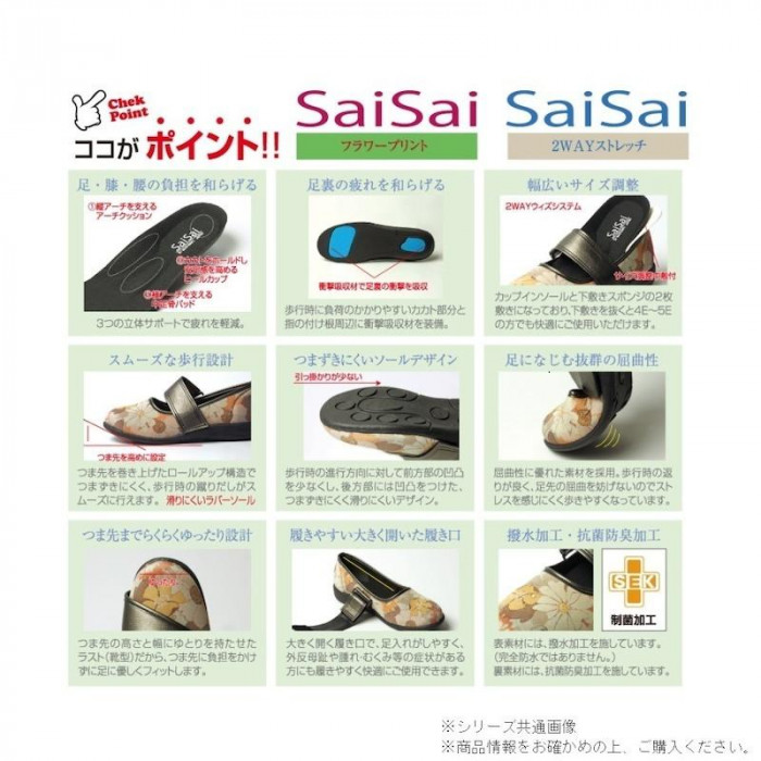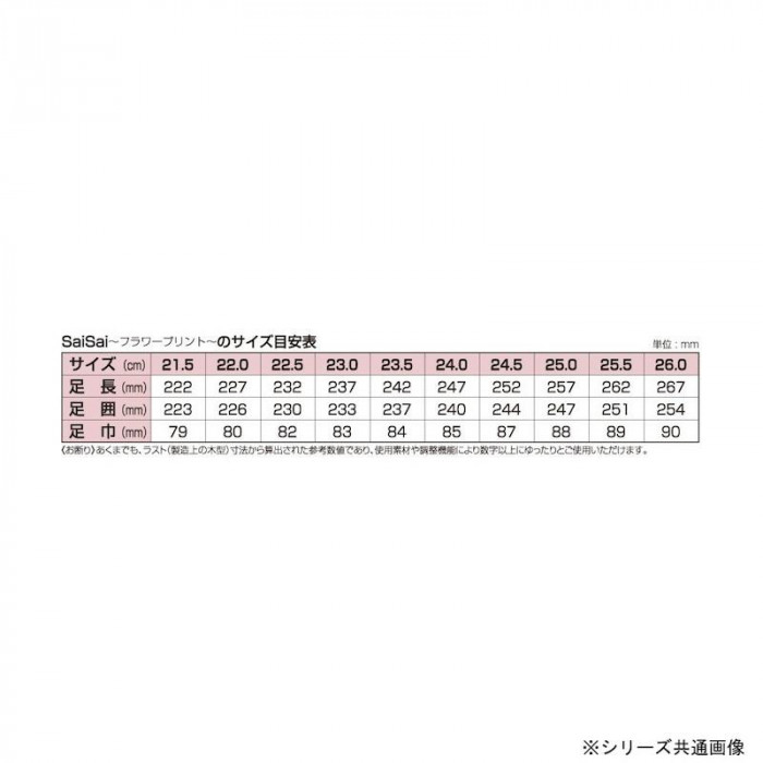 | 足を包み込むような柔らかい素材にお洒落な花柄をプリントしました。「パンプスのイイところ」と「スリッポンのイイところ」をプラスした、フィット感を調整できる万能スリッポンです。 |