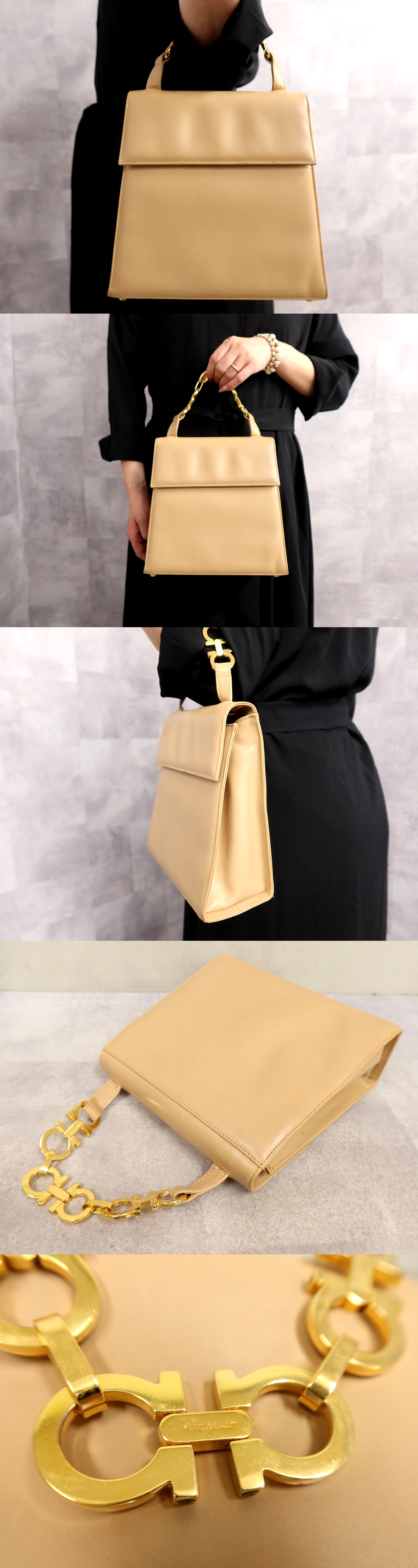 ●美品●Salvatore Ferragamo フェラガモ●ダブルガンチーニ●カーフ レザー 本革●チェーン ハンド バッグ●ベージュ●G金具●Js67381 收藏