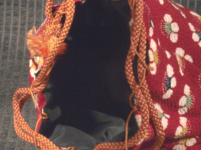 猩々緋(しょうじょうひ)色の地に横梅の文様が染められた縮緬の竹籠巾着です。 横から見た梅の花が小粋でかわいらしいですね。シボの大きな縮緬地です。 ユーズド品と思われますが、しみやよごれ、褪色などのダメージはなく、とてもきれいな状態です。 |