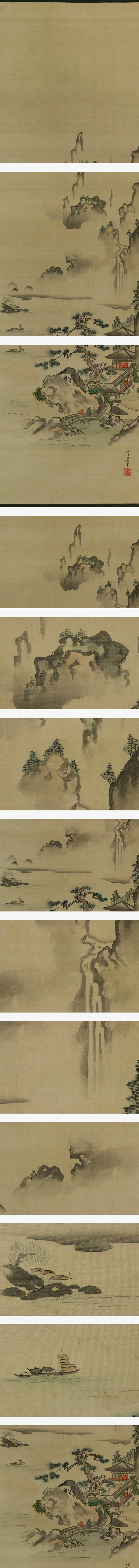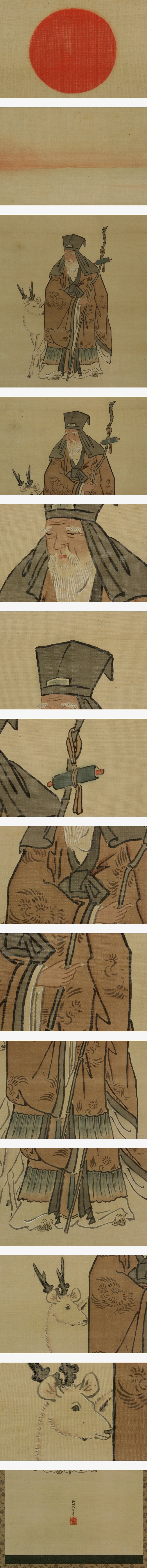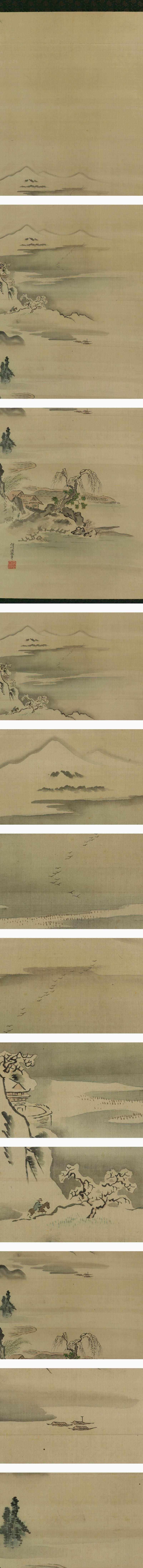 狩野伊川院 かのう-いせんいん(1775-1828) 江戸後期の画家。 養川院惟信の子。名は栄信、号は玄賞斎。 絵を父に学び、その父に「吾及ばず」と言わしめた。 近世狩野派の名手。水墨に金泥を施す技法に特色を発揮する。 また茶道を能くし松平不昧の恩顧を受ける。文化13年法印に叙せられ伊川院と称した。 文政11年(1828)歿、54才。 本紙は、染み、軽い汚れがあります。 表装は、染み、汚れ、折れ、皺、虫食い、破れ、ほつれ、ヤケがあります。 【サイズ】 作品 横約35cm×縦約111cm 表装 横約47cm×縦約195cm |