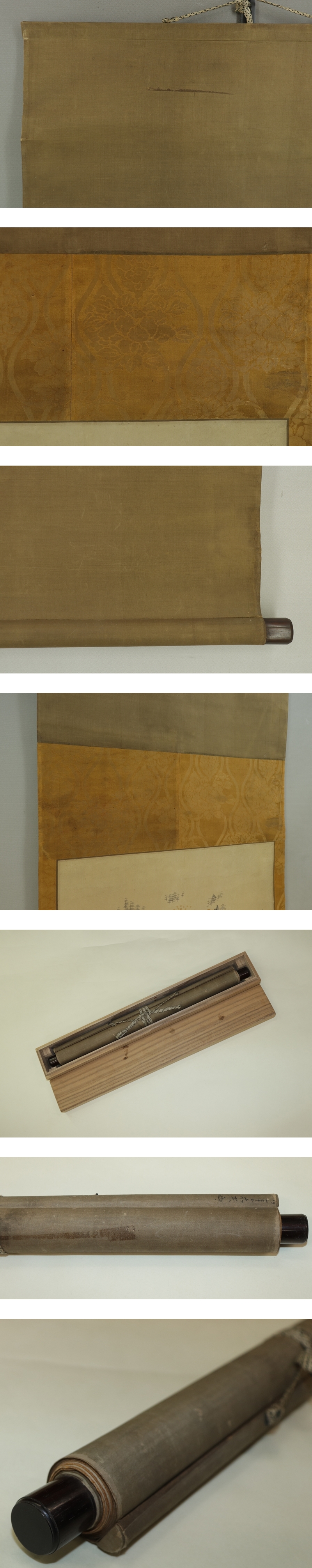 青木木米 あおき-もくべい(1767-1833) 江戸後期の陶工・南画家。京都の人。 後年、聾米と号す。煎茶器にすぐれ、交趾・染め付けなどを得意とした。 本紙は、染み、汚れ、折れ、皺、虫食い、擦れ、ヤケがあります。 表装は、染み、汚れ、折れ、皺、虫食い、擦れ、ほつれ、ヤケ、くすみ、生地剥れ、 軸先に汚れがあります。 【サイズ】 作品 横約41.5cm×縦約30.5cm 表装 横約47cm×縦約110cm |