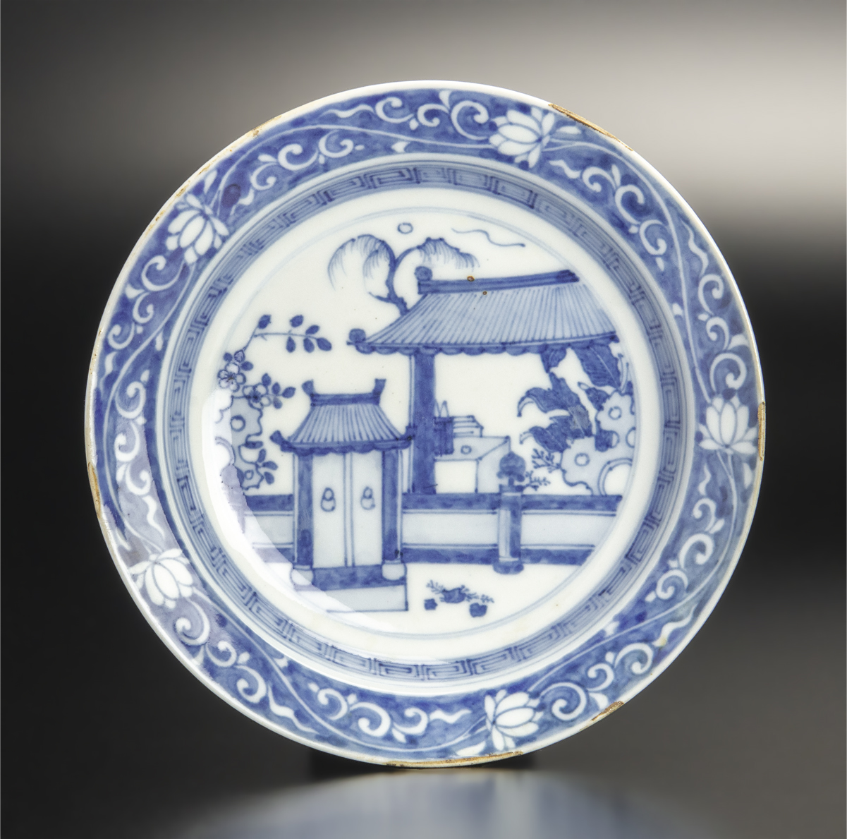 清 青花楼閣紋盤 中国 古美術 收藏