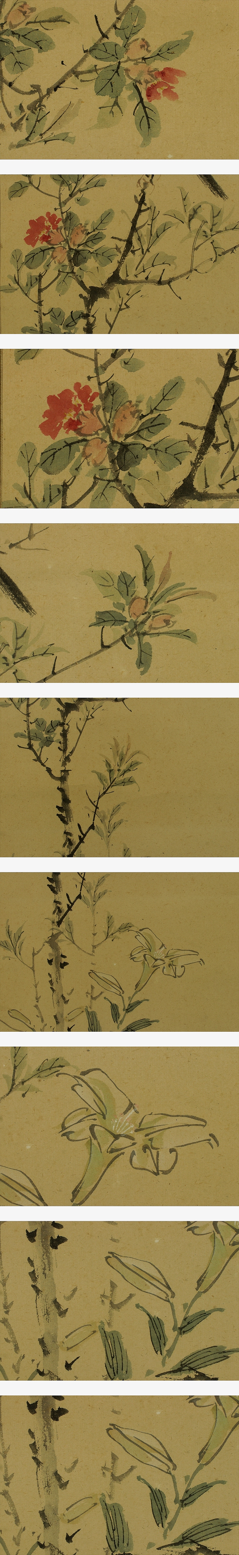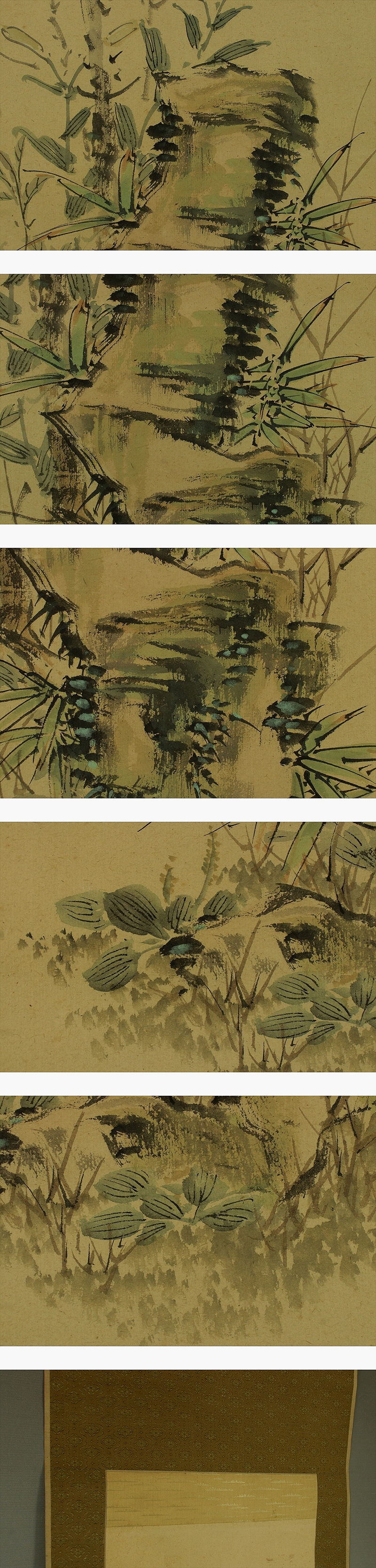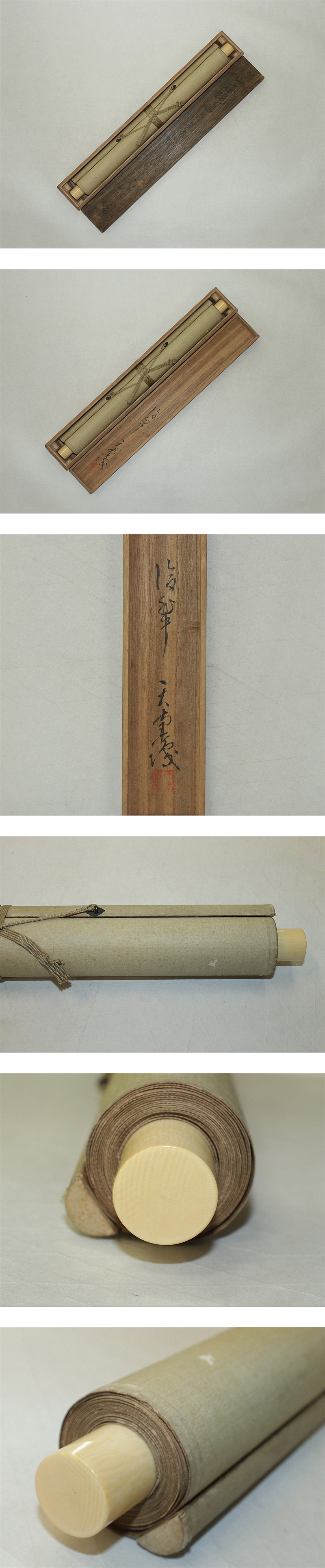 山本梅逸 やまもと-ばいいつ(1783-1856) 江戸時代後期の画家。 天明3年10月20日生まれ。 山田宮常、張月樵に学び、中林竹洞と共に京都に出て画業に励む。 花鳥画に優れ、晩年は帰郷して名古屋藩絵師格となった。 安政3年1月2日死去。74歳。名は親亮。字は明卿。 本紙は、染み、汚れ、折れ、皺があります。 表装は、染み、汚れ、軽い折れ、皺、虫食、軸先に傷みがあります。 【サイズ】 作品 横約31cm×縦約134cm 表装 横約44.5cm×縦約213cm |
