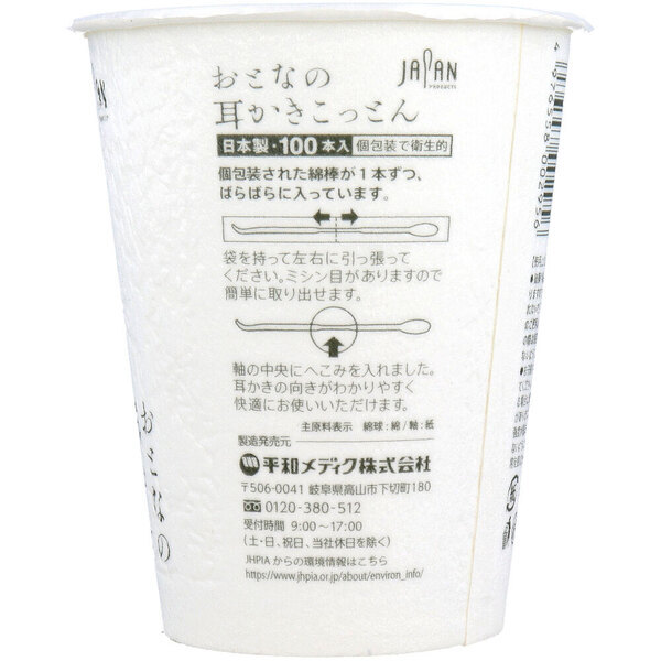 綿球を耳かき形状にした新感覚の耳かき綿棒! 耳かき形状が大きな耳垢をしっかりキャッチ。 綿棒の繊維が小さな耳垢も逃がさない。 ・コットン素材だから耳にやさしい。 ・携帯に便利な個別包装。 ・軸に耳かきの向きが分かる凹み付き。 個装サイズ:90X108X90mm 個装重量:約55g 内容量:100本入 製造国:日本 【発売元:平和メディク株式会社】 【素材】 綿部:コットン100% 軸:紙 【使用方法】 ・袋を持って左右に引っ張ってください。 ミシン目がありますので簡単に取り出せます。 ・軸の中央にへこみを入れました。 耳かきの向きが分かりやすく快適にお使いいただけます。 【注意】 ・鼓膜や粘膜を傷つける恐れがありますので、耳または鼻の奥まで入れないでください。 ・お子さまだけでのご使用はやめてください。 ・ご使用の際は周囲の状況に注意してください。 ・お子さまの手の届かないところに保管して下さい。 ・溶液等に浸してご使用する場合は、綿球が抜けやすくなることがあります。 ・へこみ加工部分はやや強度が弱まりますので、力を入れすぎないようにご注意ください。 ・万一異常を感じたら使用を中止し、医師にご相談下さい。 注意事項 予告なく成分・パッケージが変更になることがございます。 予めご了承ください。 *予告なく成分・パッケージが変更になることがございます。予めご了承ください *ダンボールを使用して発送する場合には、入数以下の個数の場合、 中古ダンボールを使用する場合があり、ご注文の商品とは異なるダンボールになる場合があります。 あらかじめ、ご了承ください。 |