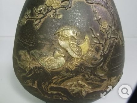 龍仙造 ◇ 銅製 花瓶 花器 共箱 煎茶 茶道具 梅花鳥図 おしどり 水鳥 古美術 ◇ 管49738 收藏