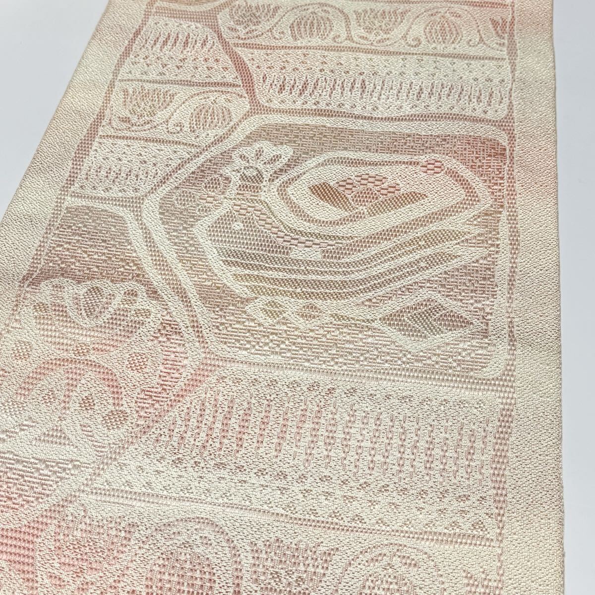 名古屋帯 正絹 八寸 博多織 白 ピンク 鳥 so049 收藏