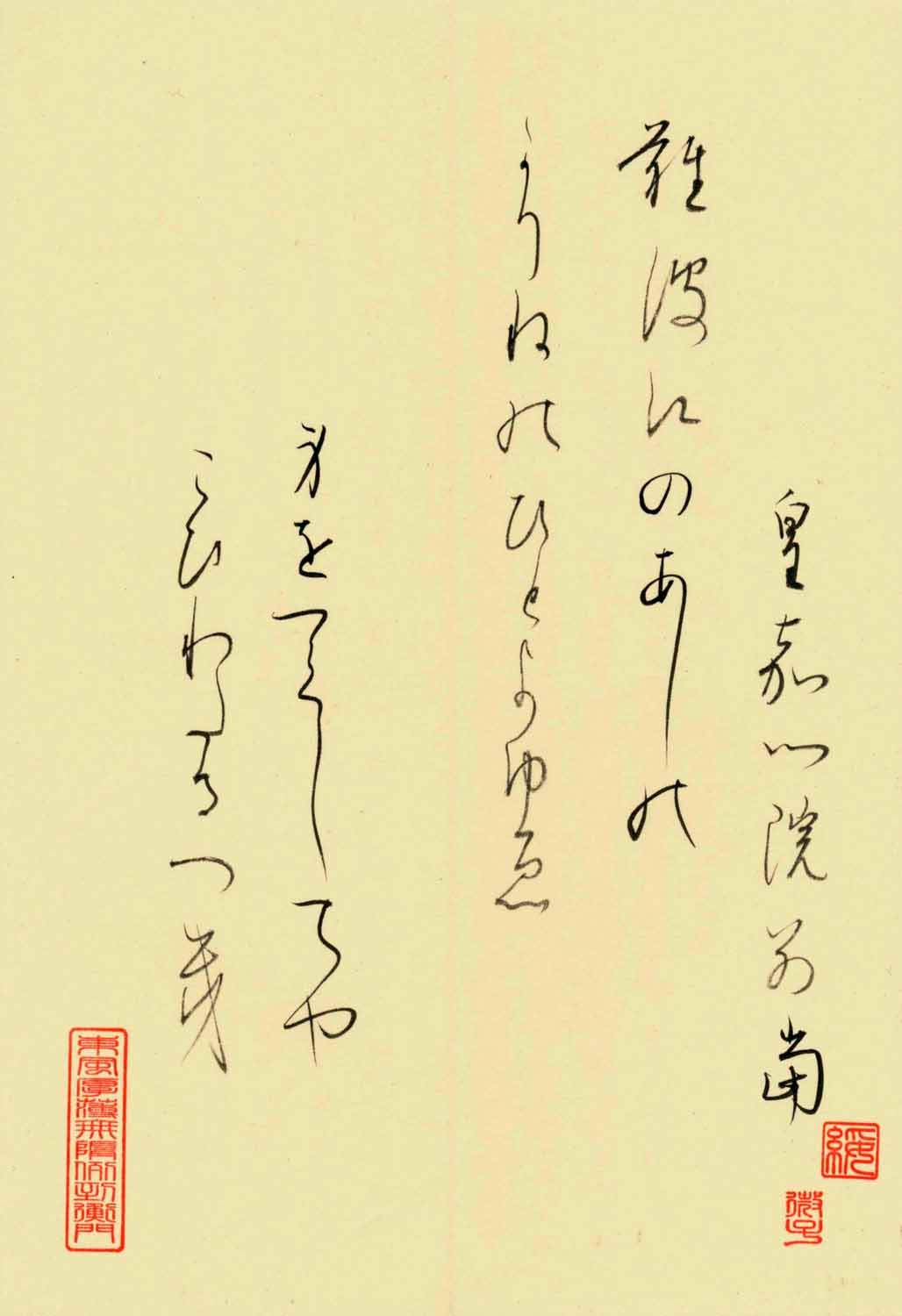 伊達徽子(のりこ)の和歌は「ちらし書」と呼ばれる書法です。文字を散らして布置するわが国独自の書き方です。この書法の歴史は平安時代の康保3年(967)の「紙背仮名消息」(滋賀・石山寺)、同じく平安時代の公卿・藤原公任(きんとう)自筆『北山抄』「仮名消息」(京都国立博物館)が知られております。各行に高低の変化をつけ、流暢(りゅうちょう)に続く連綿はきわめて美しいもので「百人一首」の書法として平安時代の公卿卿などの間で広まり、その後大名家の姫君の間で用いられておりました。