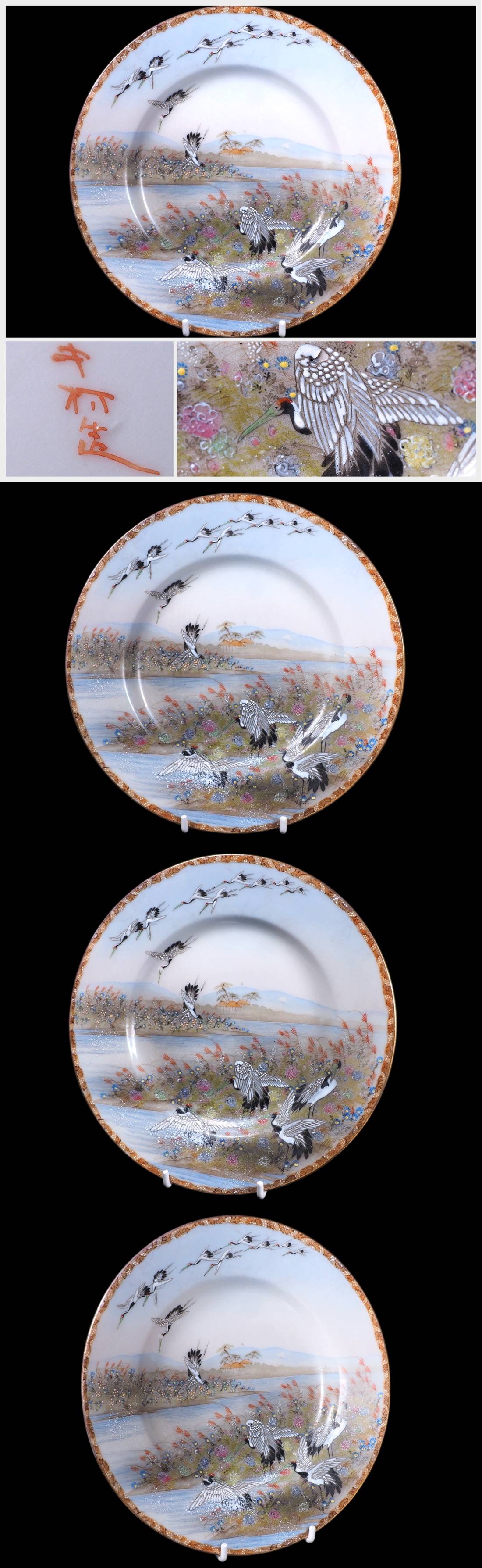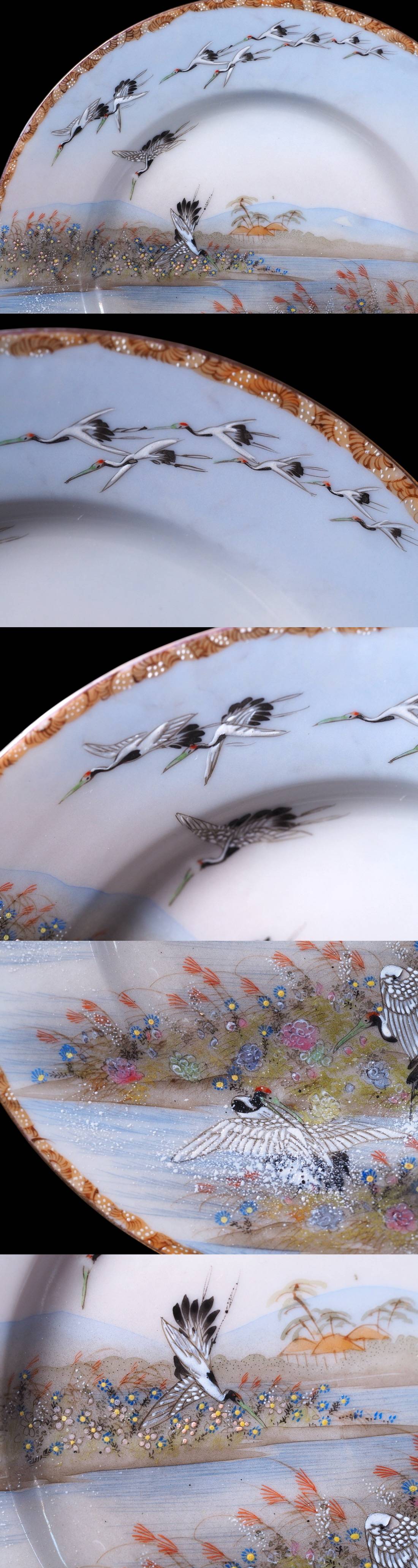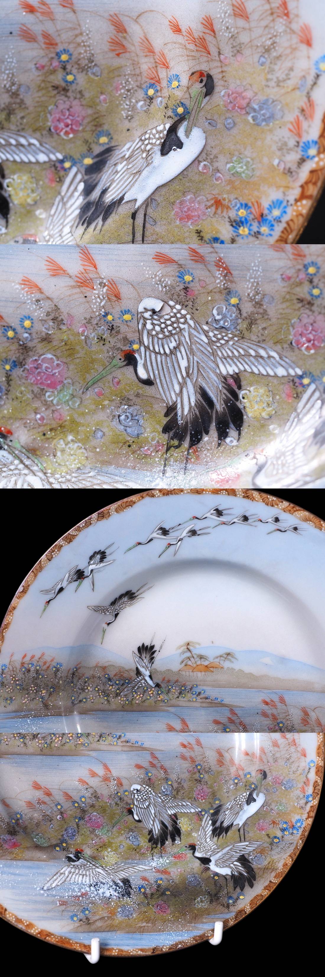 器には、悠然と飛ぶ鶴や、花やススキの近くに佇む鶴の群れが精巧に表現されており、躍動感と臨場感のある構図に仕上がっています。