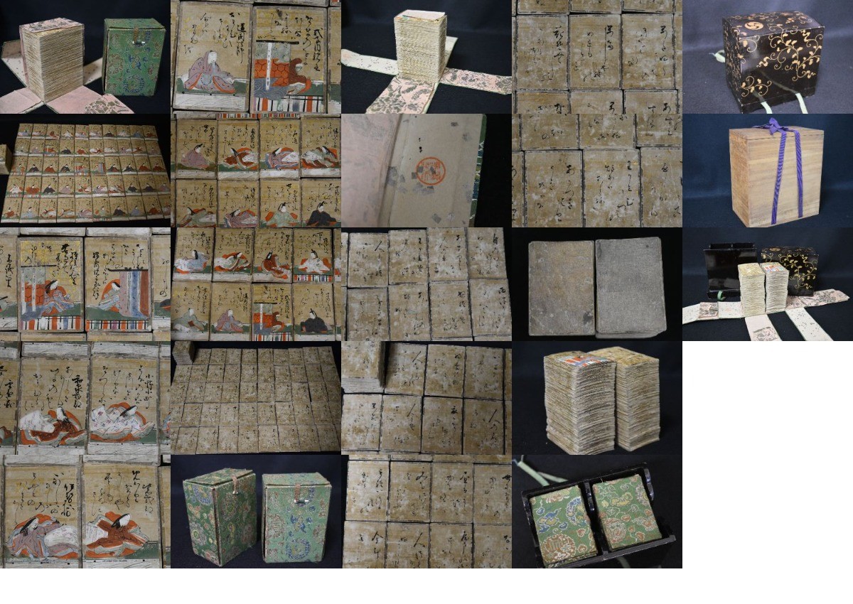 【光成】江戸期「岩絵具手書・金箔散貼・時代百人一首」全200枚・唐草塗箱・西陣織仕覆入
