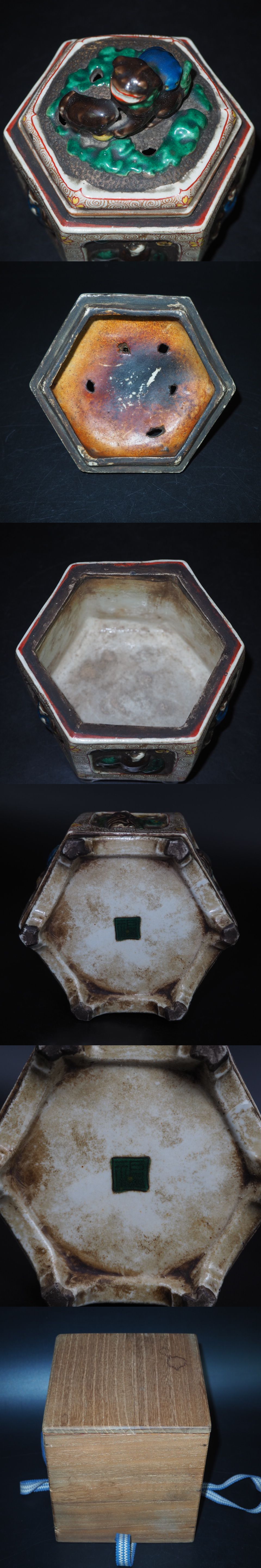 江戸時代後期 九谷焼『角福』銘 獅子紐六角香炉 本物保証 木箱 検/楽山紫砂九谷備前萩焼常滑宝生伊万里骨董中国古玩e131 收藏