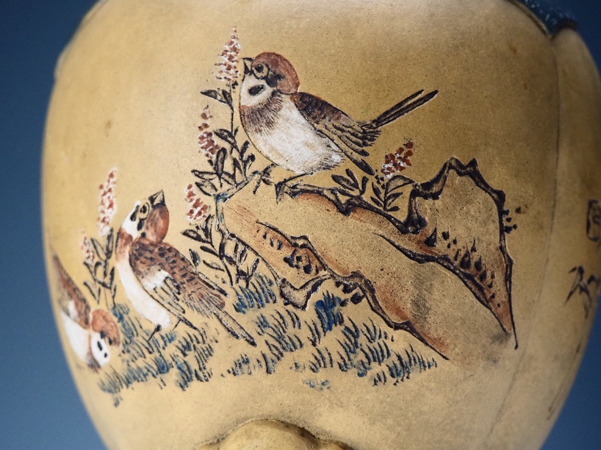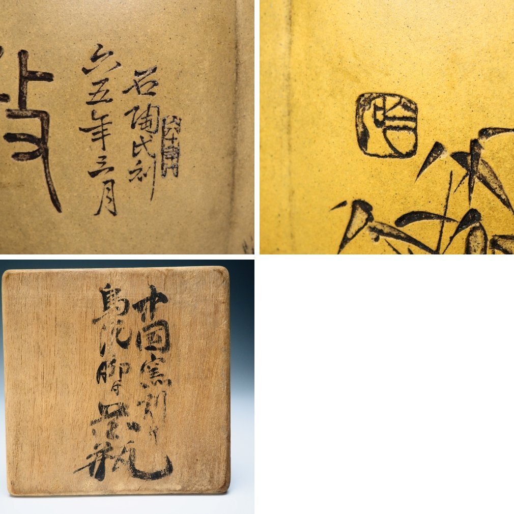 【治】『石陶氏』刻 中国古玩 漢詩色絵竹雀彫 象脚黄泥花瓶☆箱付 高さ 20.6cm (検索:中国宜興 壷 朱泥 花器 花入 置物 紫砂 唐物) FM60 收藏
