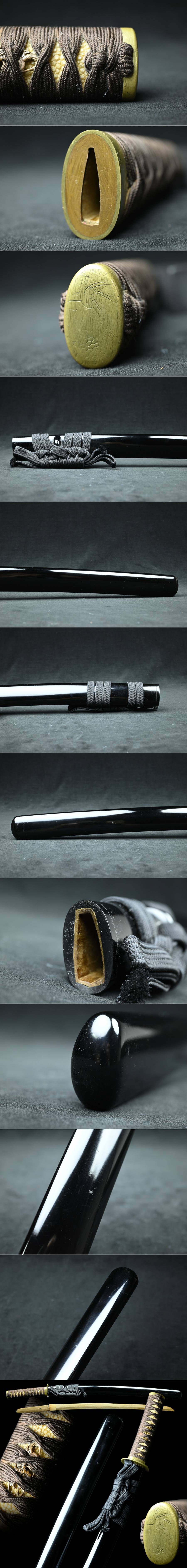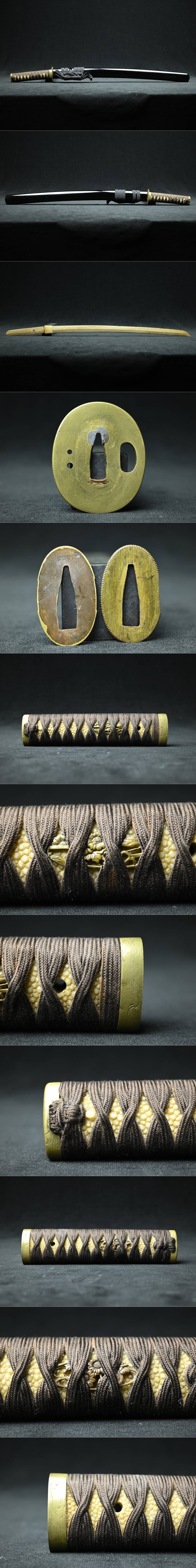 【昊】時代 黒漆塗鞘 花目貫 鶴亀頭 鮫革巻外装拵え 刀装具[IN51Yi] 收藏