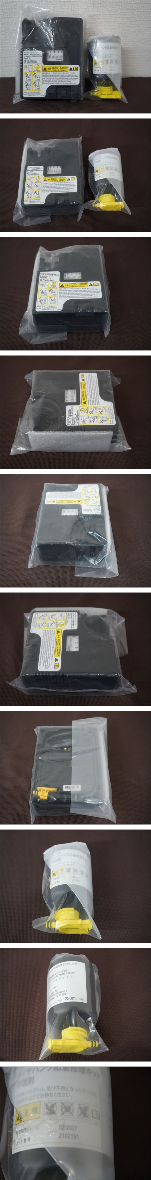 | 商品説明 | ●ダイハツ純正品 応急 パンク応急修理キット エアコンプレッサー (未使用品) ●パンク修理剤の有効期限は、2027年2月と記載がされています。 ●比較的に綺麗な状態で、画像に映っている2点になります。掲載した画像にて、状態の確認をお願い致します。 |