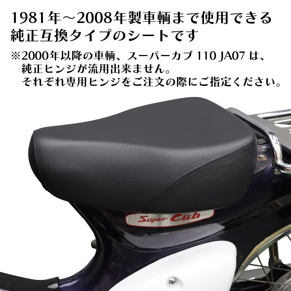 | ■スーパーカブC50/C70/C90 AA01/HA02 ※1(80年以前・JA10/AA04以降は非適合) ■スーパーカブ110(JA07) ※2 ※1 2000年以降のモデルにお使いいただく場合、純正のヒンジが流用できませんので、シートヒンジを合わせてご購入ください。 ※2 スーパーカブ110(JA07型)にお使いいただく場合、純正のヒンジが流用できませんので、シートヒンジを合わせてご購入ください。 *ご注文時にプルダウンにてヒンジが必要・不必要かを選択してください。 *こちらのシートは出荷前に取り付け・外観を検品済です。 |