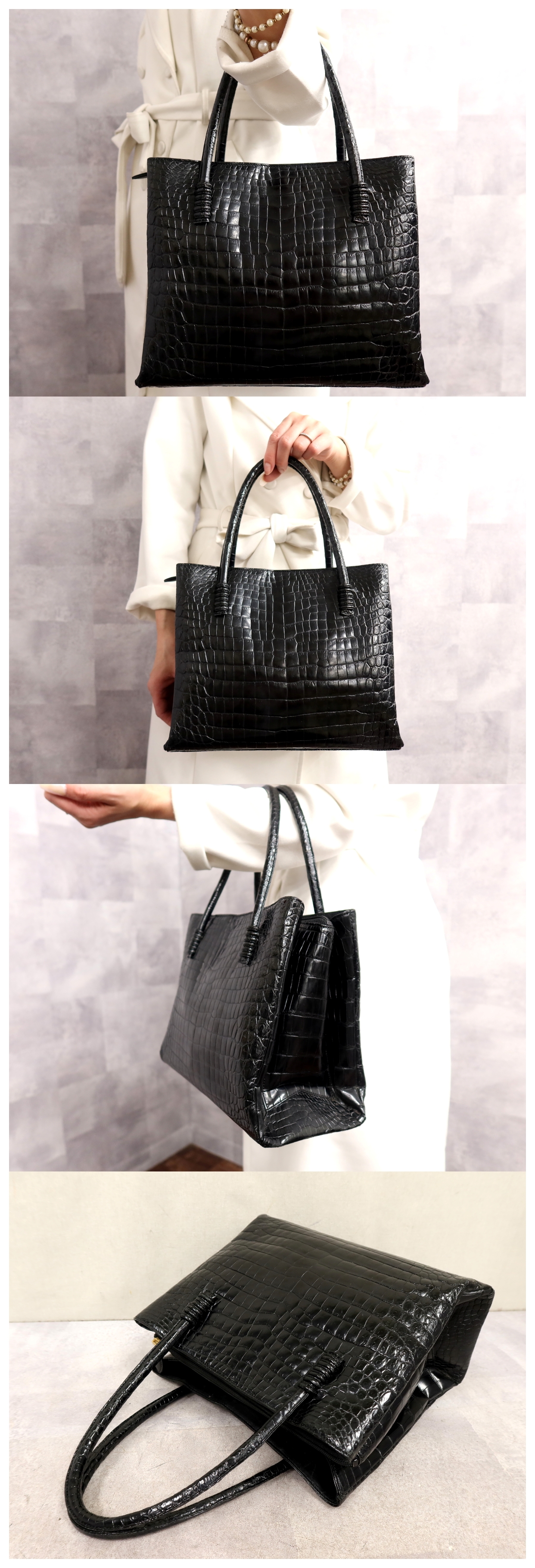 ●超美品●GENUINE●マット クロコダイル 本 ワニ 革●トート ハンド バッグ●ブラック●ゴールド金具●腕掛け●かばん●Js65077 收藏