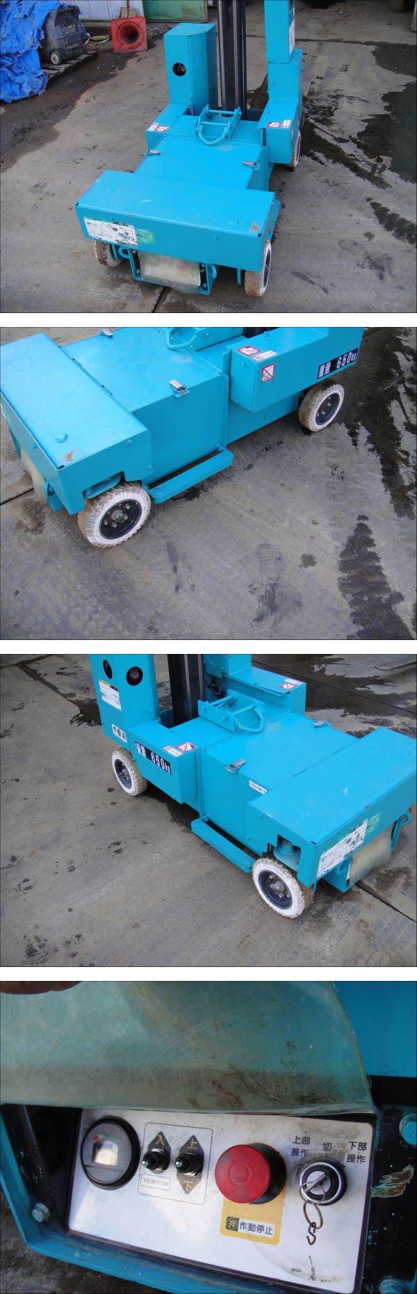| 商品説明 | ☆タイヤ自走 高所作業車SV-04Bです。 ☆アイチ 2012/10製造で、稼働時間は。5656時間です。 ☆重量650kgです。 ☆作動確認しておりますが、バッテリの消耗度は、解りませんが、現在正常に作動しております。 ☆タイヤの消耗は、写真を参照してください。 ☆仕様については、写真を参照してください。 ☆致命的な欠陥があった場合は、返金します。(但しバッテリーの消耗については、クレームなしです。) ☆関東近県でしたら、2万円で、回送します。 ☆引取歓迎です。積込は当方でします。 |