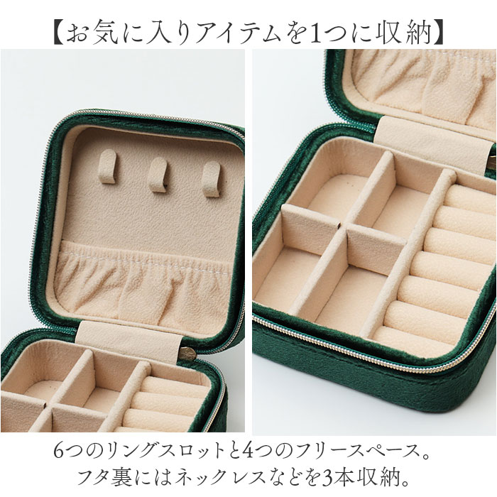 | 商品説明 | ・・【すっきりまとめて持ち運び♪】 ・旅行などでも大切に保管できる♪コンパクトな「ジュエリーボックス」が新登場。 ・【大人女子にぴったりな上品さ】 ・しっとりとした質感で、落ち着きのある雰囲気演出。年代問わず使いやすさ抜群。 ・【ぐるっと大きく180度オープン】 ・ラウンドファスナーで、スムーズに開閉。中身を確認しやすく、出し入れもラクラク。 ・【お気に入りアイテムを1つに収納】 ・・6つのリングスロットと4つのフリースペース。フタ裏にはネックレスなどを3本収納。 ・【長さのあるチェーンも絡まず安心】 ・フタ裏フックの下には、ギャザーポケット付き。チェーンの絡まりを防げて便利。 ・【仕切りを取り外せて使い方自在】 ・フリースペースの仕切りは、取り外し可能。収納するアイテムの大きさに合わせて使い分け。 ・【大切なアイテムをしっかり保護】 ・柔らかな素材の内張り仕様。大切なアクセサリーを傷や衝撃からガード◎ ・【バッグに忍ばせておけるサイズ感】 ・手のひらに乗るくらいのスクエア型。旅行や出張時のバッグにサクッとIN! ・【お気に入りを選べるカラー】 ・やや光沢のあるカラーリングに、ゴールド金具がマッチ。鮮やかな色合いをラインナップ。 |