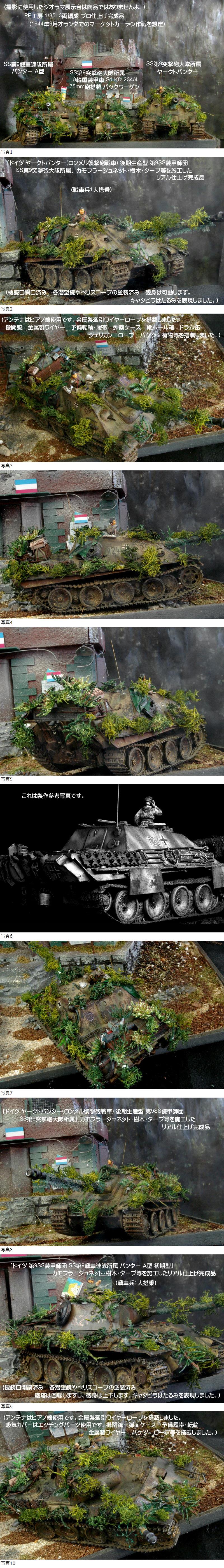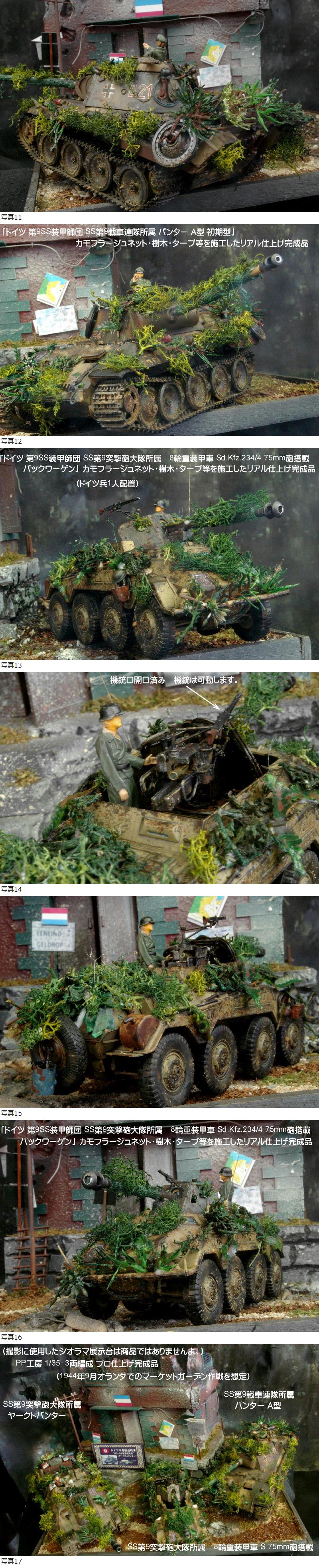 | ■今回の作品もジオラマではなく、3両編成完成品です。当店委託のプロモデラーが「ヘアスプレーチッピングやカモフラージュネット・樹木・タープ等」を施工するなどリアルに製作しており、クオリティは以下の商品説明の画像でも確認して下さいね。(撮影に使用したジオラマ展示台は、商品ではありませんよ。) ①1/35 「ドイツ ヤークトパンター(ロンメル襲撃砲戦車) 後期生産型 第9SS装甲師団 SS第9突撃砲大隊所属」 カモフラージュネット・樹木・タープ等を施工した リアル仕上げ完成品 (アンテナはピアノ線使用です。金属製牽引ワイヤーロープを搭載しました。機関銃 金属製ワイヤー 予備転輪・履帯 弾薬ケース 段ボール箱 ドラム缶 ジェリカン ロープ バケツ 荷物 など多数の装備品を搭載しました。) ドイツ戦車兵1人を搭乗させました。 ②1/35 「ドイツ 第9SS装甲師団 SS第9戦車連隊所属 パンター A型 初期型」 カモフラージュネット・樹木・タープ等を施工したリアル仕上げ完成品 (アンテナはピアノ線使用です。金属製牽引ワイヤーロープを搭載しました。吸気カバーはエッチングパーツ使用です。機関銃 弾薬ケース 予備履帯・転輪 金属製ワイヤー バケツ ロープ等を搭載しました。)ドイツ戦車兵1人を配置しました。 ③1/35 「ドイツ 第9SS装甲師団 SS第9突撃砲大隊所属 8輪重装甲車 Sd.Kfz.234/4 75mm砲搭載 パックワーゲン」 カモフラージュネット・樹木・タープ等を施工したリアル仕上げ完成品 (アンテナはピアノ線使用です。機関銃 弾薬ケース ジェリカン 予備転輪 金属製ワイヤー バケツ ロープ等を搭載しました。)ドイツ兵1人を配置しました。 ■緻密で繊細に製作しており、とても精度の高い作品ですが、史実に忠実に表現したわけではありませんよ。ドイツ占領下のオランダ ニューネン攻防戦を想定しました。(1944年9月 マーケット・ガーデン作戦では、ニューネン近郊にドイツ第9SS装甲師団などが一時駐留していたという不運も重なり、イギリス第1空挺師団が壊滅するなど連合軍が敗退しております。) ■ヤフー画像検索で「PP工房完成品」と検索いただければ、当店の最近の作品の画像を見ることができますので、そちらも見ていただければ幸いです。・・・PP工房完成品 ★使用パーツなど(以下の作品がすべて付いてきますよ。) 1 1/35 タミヤ ヤークトパンサー(ロンメル襲撃砲戦車)(機銃口開口済み 各潜望鏡やペリスコープの塗装済み 砲身は可動します。キャタピラはたるみを表現しました。)戦車兵1人を配置しました。 2 1/35 タミヤ パンサー A型(機銃口開講済み 各潜望鏡やペリスコープの塗装済み 砲塔は回転しますし、砲身は上下します。キャタピラはたるみを表現しました。モーターライズモデルをディスプレイタイプに改良しました。)戦車兵1人を配置しました。 3 1/35 イタレリ Sd.Kfz.234/4 75mm砲搭載 パックワーゲン(機銃口開口済み 機銃は可動します。)ドイツ兵1人を配置しました。 4 金属製ネームプレート板「ヤークトパンター」を配置しました。 ■当店(PP工房)では、プラモ完成品を週3回位の割合で出品しておりますので、よろしくおねがいしますね。 | |