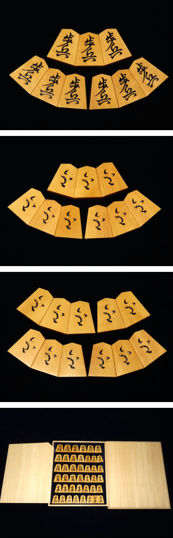 木地は御蔵島黄楊糸柾。ご覧のとおり非常に味のよい木地です。全ての駒の表裏をUPいたしましたので是非ご覧ください。