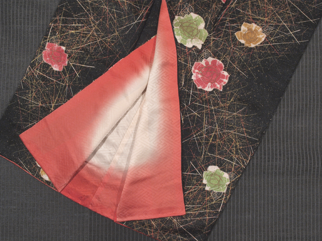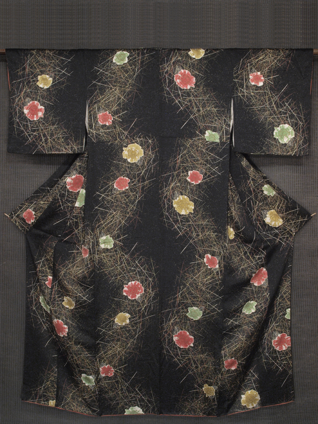 | 詳細 | 黒色の地に、柏の葉の地紋が織り出され、幾何学調のよろけ縞と薔薇の文様が染められている、綸子の小紋です。袷仕立てです。 遠目で見たときにキッチュなかわいらしさと幻想的な雰囲気が感じられます。アンティークな装いがお好みの方にもおすすめできる意匠です。 ユーズド品で、文様の白色地部分に若干のくすみが感じられる部分がありますが、判別はつかず、気にはなりません。そのほかに目につく大きなしみやよごれ、褪色などのダメージはなく、全体的にはとてもきれいな状態です。 |