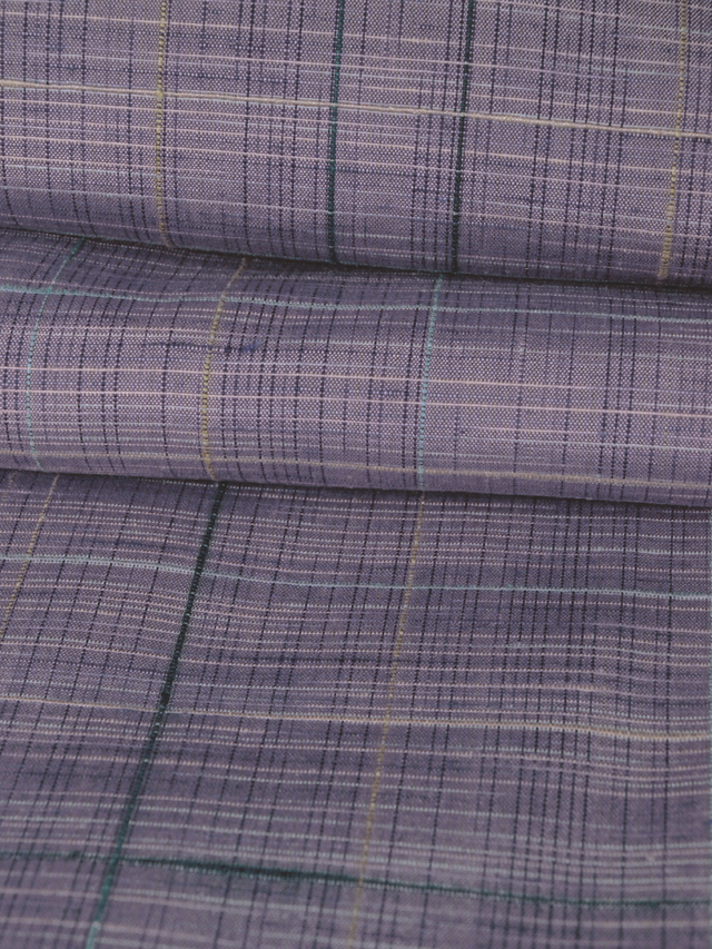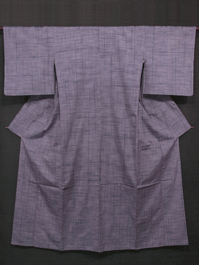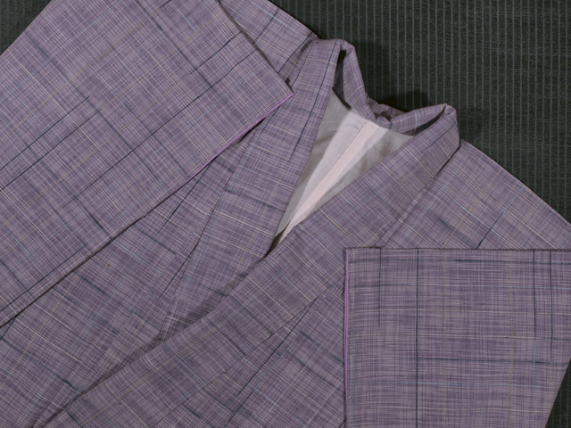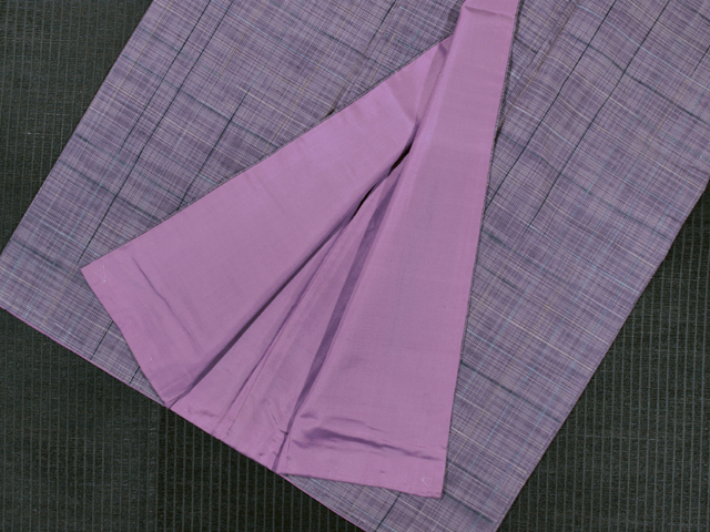 全体的な印象としては紫苑色といった感じの地に、淡い水色、黄緑色、薄桜色、濃藍(こいあい)色などでとぎれ格子縞の文様が織り込まれている紬です。袷仕立てです。 艶やかなお色目で、しっとりとした小粋さが感じられます。ややさらりとした手ざわりの紬地です。八掛を変えていただけると、もっと素敵なお着物になりそうです。 しつけ付きの仕立て上がり未使用保管品ですが、胴裏がわずかにうっすらと黄変気味です。そのほかに目につくしみやよごれ、褪色などのダメージはなく、きれいな状態です。 |