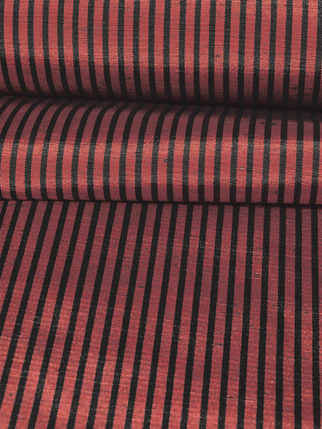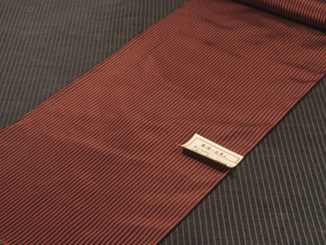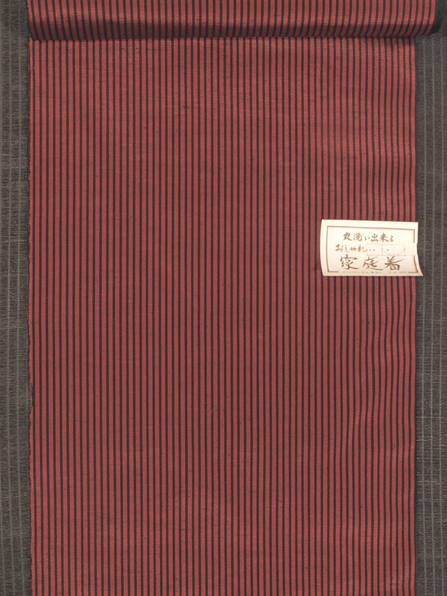 やや淡く沈んだ茜色の地に、ほぼ黒色に見える濃藍(こいあい)色のたて縞の文様が織り込まれている、上っ張り(ホームコート)地です。 節のある紬地風です。化繊と綿の交織なので、やわらかでなめらかな地風です。 未仕立て未使用保管品です。中まで確認しましたが、しみやよごれ、褪色などのダメージはなく、新品同様です。 |