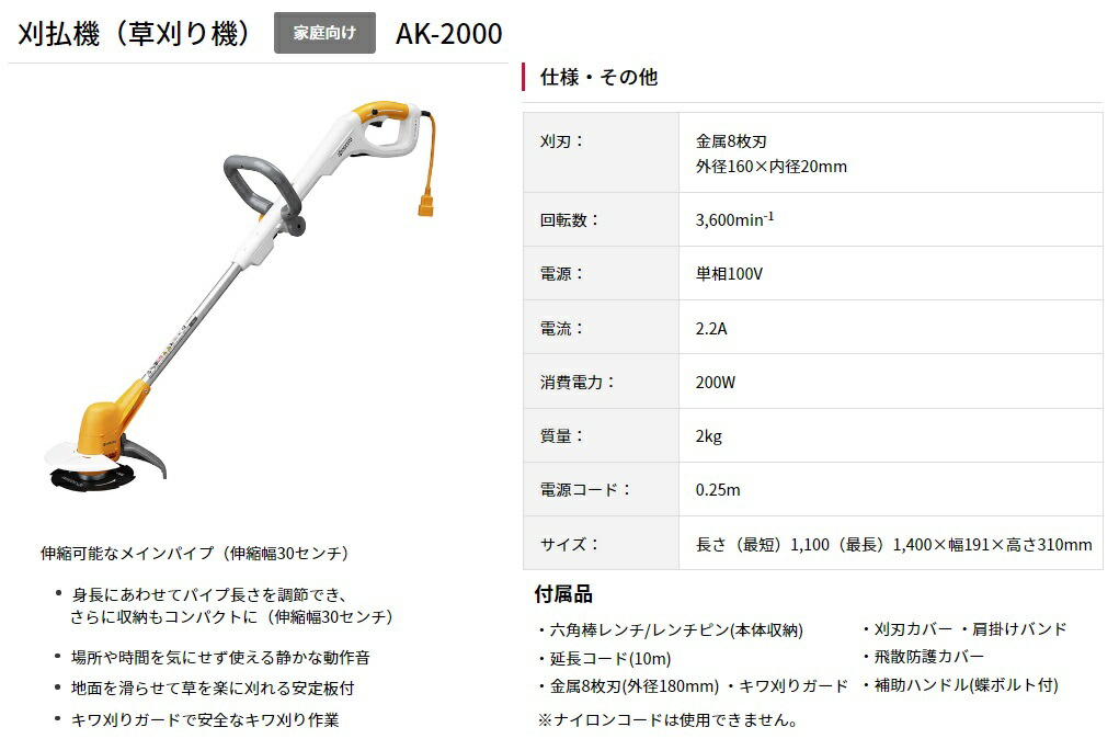 京セラインダストリアルツアーズ株式会社刈払機AK2000■特長・身長にあわせてパイプ長さを調節でき、さらに収納もコンパクトに(伸縮幅30センチ)・場所や時間を気にせず使える静かな動作音・地面を滑らせて草を楽に刈れる安定板付・キワ刈りガードで安全なキワ刈り作業■付属品・六角棒レンチ/レンチピン(本体収納)・延長コード(10m)・金属8枚刃(外径180mm) ・キワ刈りガード・刈刃カバー ・肩掛けバンド・飛散防護カバー・補助ハンドル(蝶ボルト付)※ナイロンコードは使用できません。