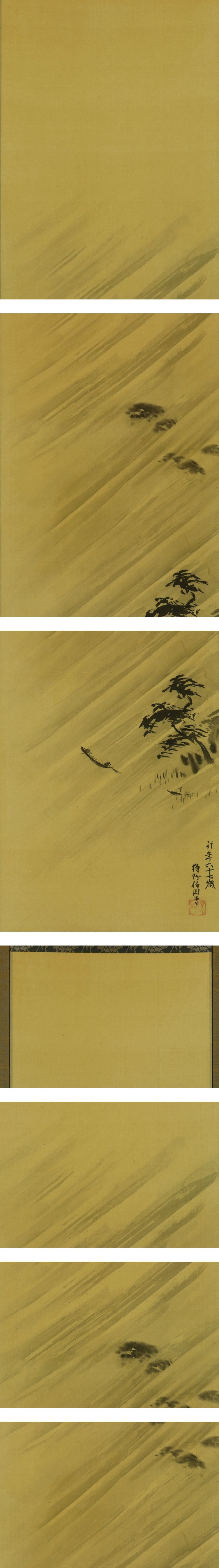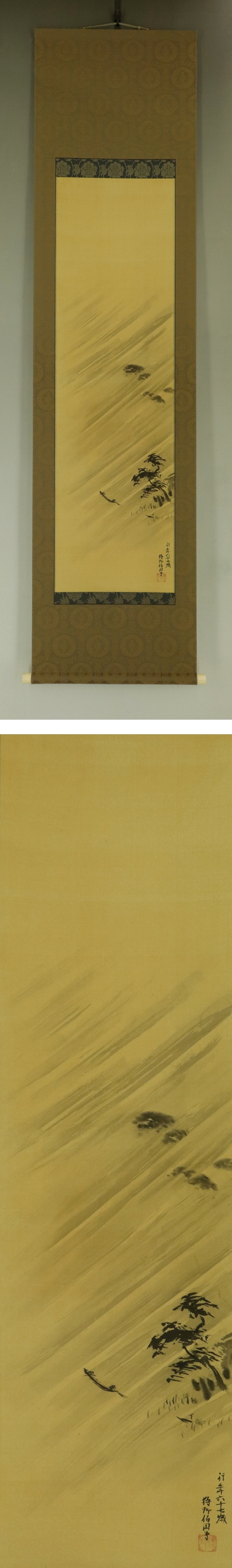 狩野伯円 かのう-はくえん(1642-1726) 江戸時代前期-中期の画家。寛永19年生まれ。神田松永町狩野家の友益の子。 加賀金沢藩に仕える。日光東照宮の装飾や朝鮮に送る屏風画の制作などに携わった。 享保11年8月12日死去。85歳。名は方信(景信,友信とも)。別号に意仙斎。 本紙は、染み痕があります。 表装は、軸先に軽い汚れとヒビがあります。 【サイズ】 作品 横約32cm×縦約113cm 表装 横約44cm×縦約178cm |