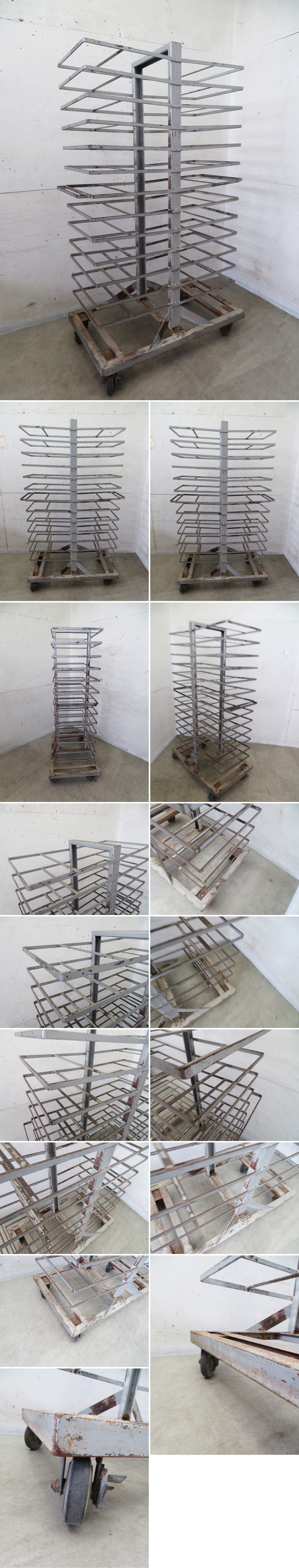 無骨で力強い存在感を放つ、インダストリアルスタイルの天板収納トンボラックのご紹介です。 全体はグレー塗装の鋼材で構成され、使用感や経年による塗装の剥がれ、サビなどが、かえって味わい深いヴィンテージ感を醸し出しています。 棚フレームは、パン屋や工場などでのトレイ収納を想起させ、什器としての実用性だけでなく、 ディスプレイ什器やガレージ収納、アトリエの素材置きなど、多用途に活躍。 上から下まで均一に空間が確保されているため、店舗什器としてもぴったりです。 下部には頑丈なキャスターが4つ備わっており、重量感ある本体でもスムーズに移動可能。 キャスターの一部にはストッパーも付いているため、安全性にも配慮されています 大変おすすめですのでこの機会にぜひ!!! コンディション:中古のため写真のように使用感、傷、汚れはありますがその他はとくに大きなダメージもなく、使用に問題ありません。 サイズ横97センチ奥行き54センチ高さ156センチです。