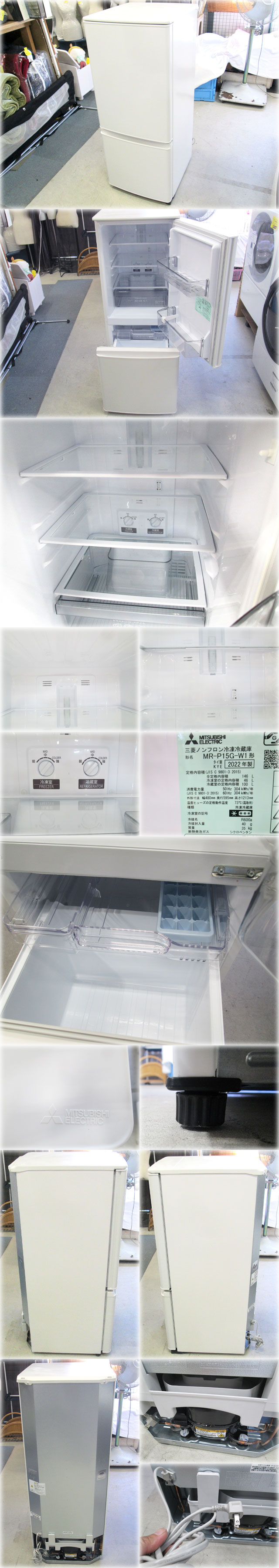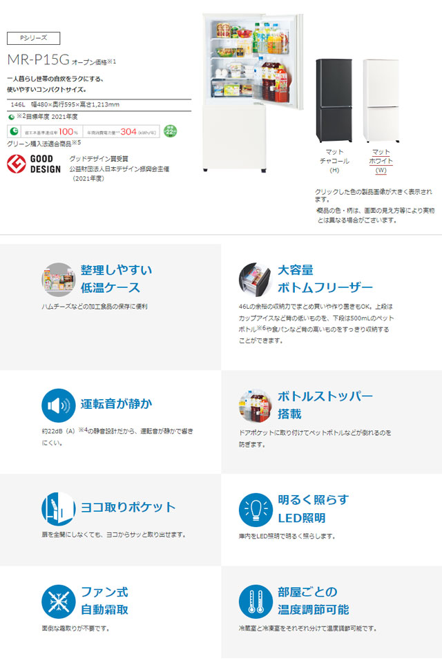 【2022年製】三菱電機 2ドア冷蔵庫 MR-P15G-W1 480x595x1213mm 146L(冷蔵100L/冷凍46L) ホワイト フルフラットトップ ボトムフリーザー 收藏