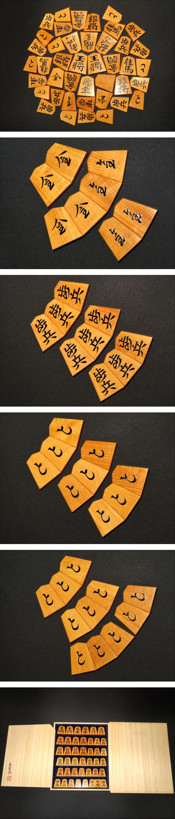 木地は本黄楊赤柾。ご覧のとおり非常に味のよい木地です。中国産木地と伺いました。全ての駒の表裏をUPいたしましたので是非ご覧ください。