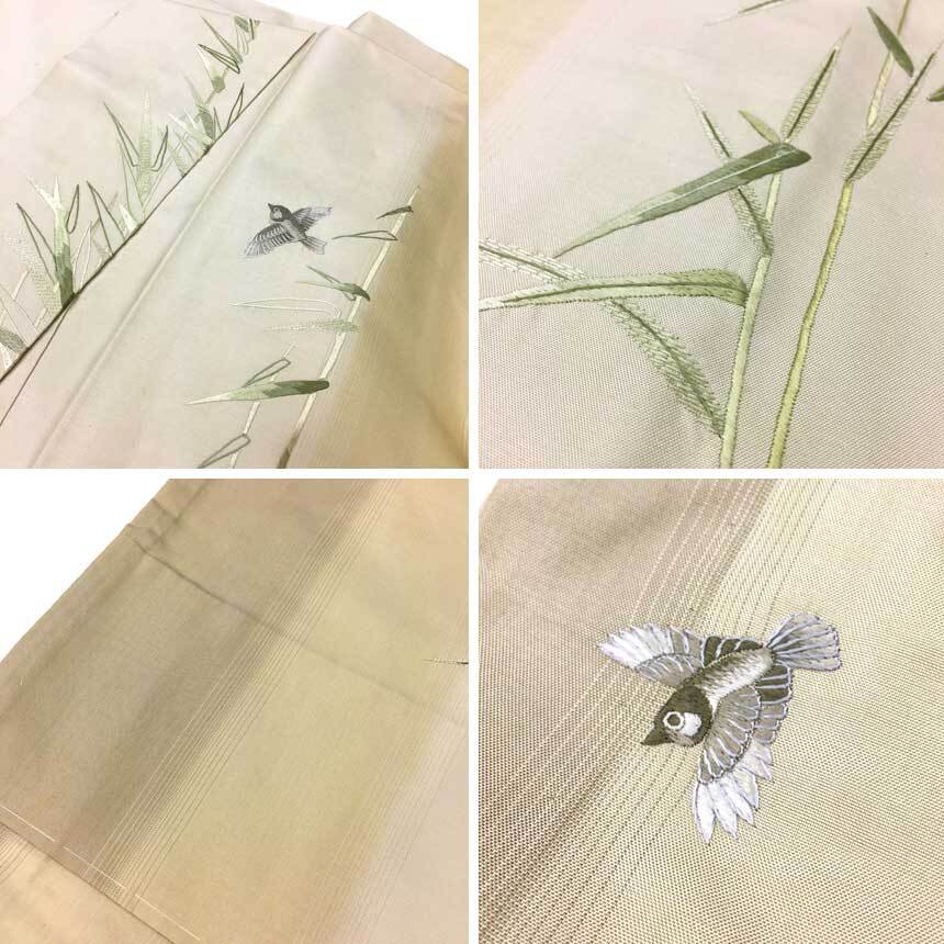 セール 京やH144 正絹 究極の逸品 特選本手総刺繍紬訪問着 特選本場縞大島紬 縞大島 紬の訪問着 手刺繍 刺繍 笹竹林に雀 未使用 收藏
