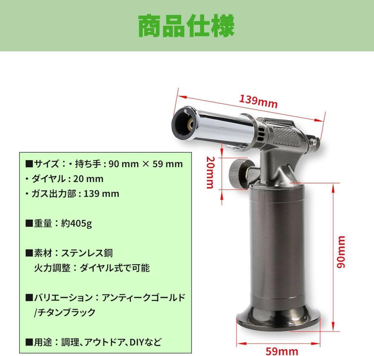 商品仕様 サイズ:・持ち手 : 90 mm × 59 mm ・ツマミ : 20 mm ・ガス出力部 : 139 mm