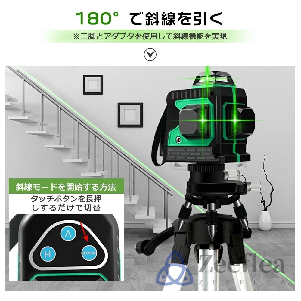 縦360°フルラインが90°にクロスし、天墨と地墨を形成し、部屋の間仕切りで大活躍できます。また横も4方向にレーザー光を射出することでラインが横全周に広がり、タイルを貼るなどの場合は本体を回す必要がなく作業効率が大幅にアップします。このレーザーレベルを使用すると、ユーザーは3x 360°レーザープレーン(1本の水平線と2本の垂直線)を生成することにより、レベルを揃え、位置合わせし、正方形にし、垂直にすることができます。