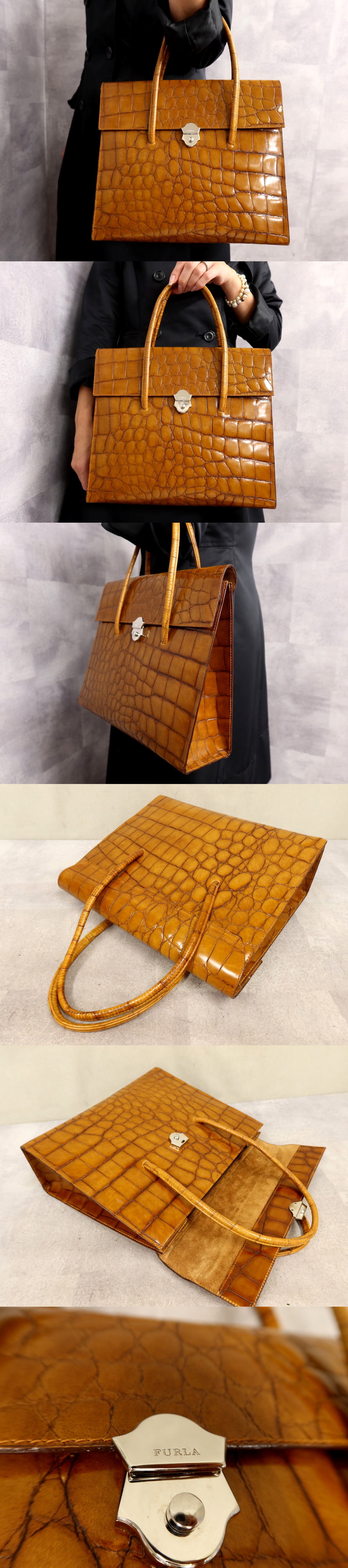 ●超美品●FURLA フルラ●クロコダイル 型押し カーフ レザー 本革●トート ハンド バッグ●キャメル●シルバー金具●B5 収納●Js62114 收藏