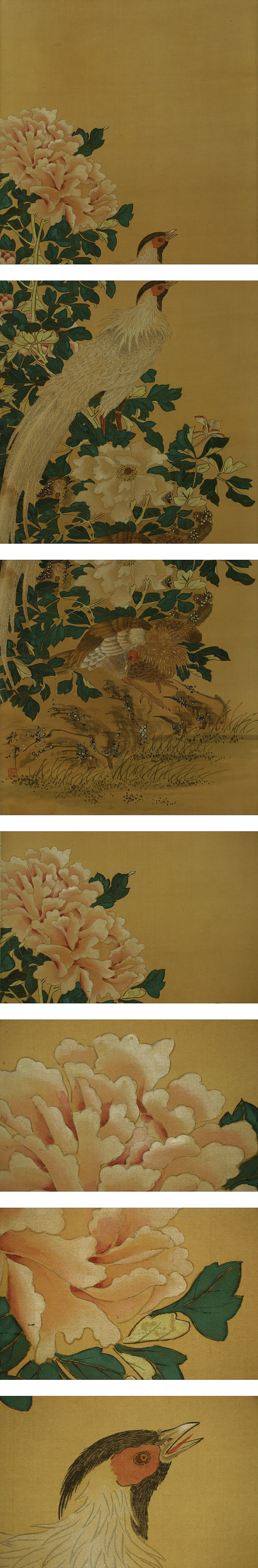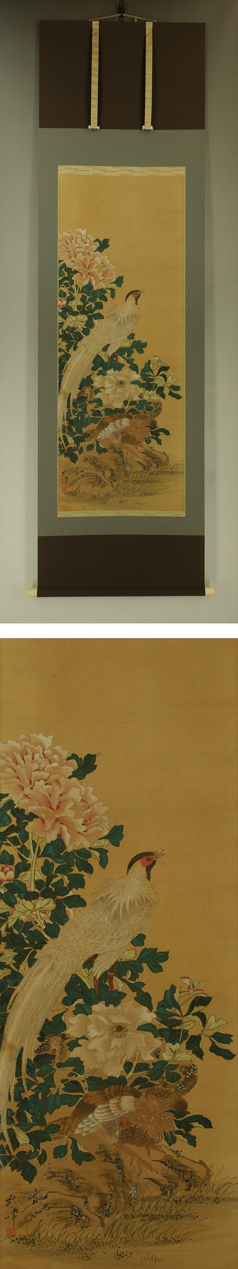 岡本秋暉 おかもと-しゅうき(1807-1862) 江戸後期の画家。江戸生。 名は隆仙、字は柏樹、通称は祐之丞、晩年は秋翁と号す。 小田原藩主大久保家に仕える。 始め画を大西圭斎に、のち渡辺崋山に学び、沈南蘋など明清の画風に習った。 写実的で精緻な表現を基調に装飾性が加味された花鳥画も得意とした。 文久2年(1862)歿、56才。 本紙は、染み、剥落があります。 表装は、改装済みの為きれいです。 【サイズ】 作品 横約41cm×縦約109.5cm 表装 横約54.5cm×縦約187cm |