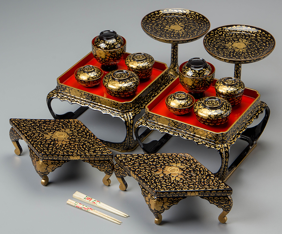 【五】雛道具 木製漆塗 牡丹唐草蒔絵 色々(懸盤膳・高坏・菱台等) 箱付 收藏