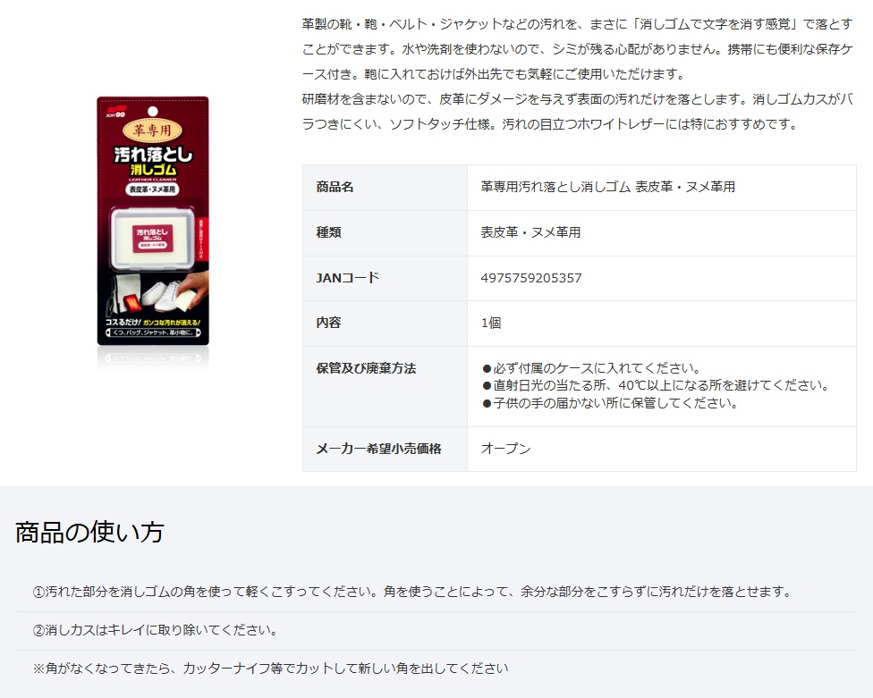 ソフト99 (SOFT99)革専用汚れ落とし消しゴム 表皮革・ヌメ革用■特長革製の靴・鞄・ベルト・ジャケットなどの汚れを、まさに「消しゴムで文字を消す感覚」で落とすことができます。水や洗剤を使わないので、シミが残る心配がありません。携帯にも便利な保存ケース付き。鞄に入れておけば外出先でも気軽にご使用いただけます。研磨材を含まないので、皮革にダメージを与えず表面の汚れだけを落とします。消しゴムカスがバラつきにくい、ソフトタッチ仕様。汚れの目立つホワイトレザーには特におすすめです。■保管及び廃棄方法●必ず付属のケースに入れてください。●直射日光の当たる所、40℃以上になる所を避けてください。●子供の手の届かない所に保管してください。