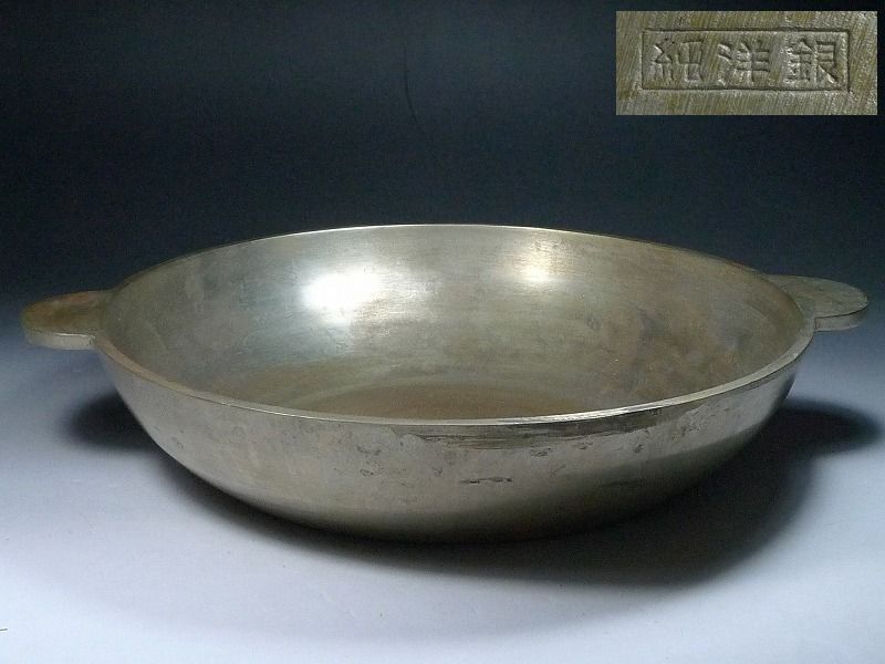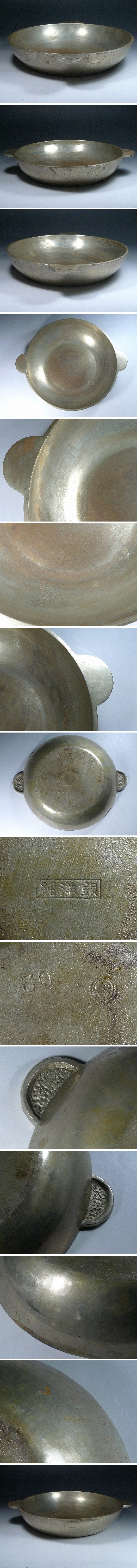 8009N04*2C▲純洋銀鍋 両手鍋 直径約30㎝ 重さ約4㎏ ちり鍋 天ぷら鍋 料亭 調理器具 レトロ 收藏