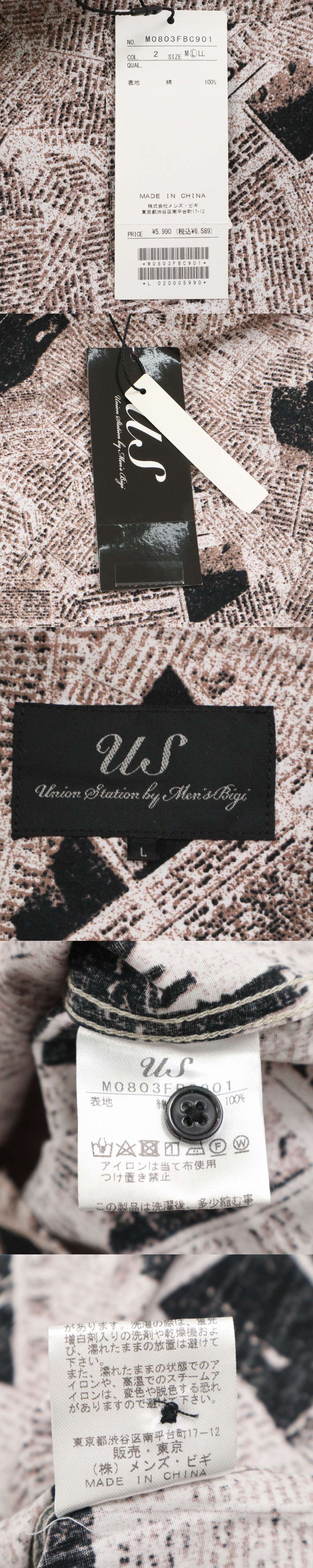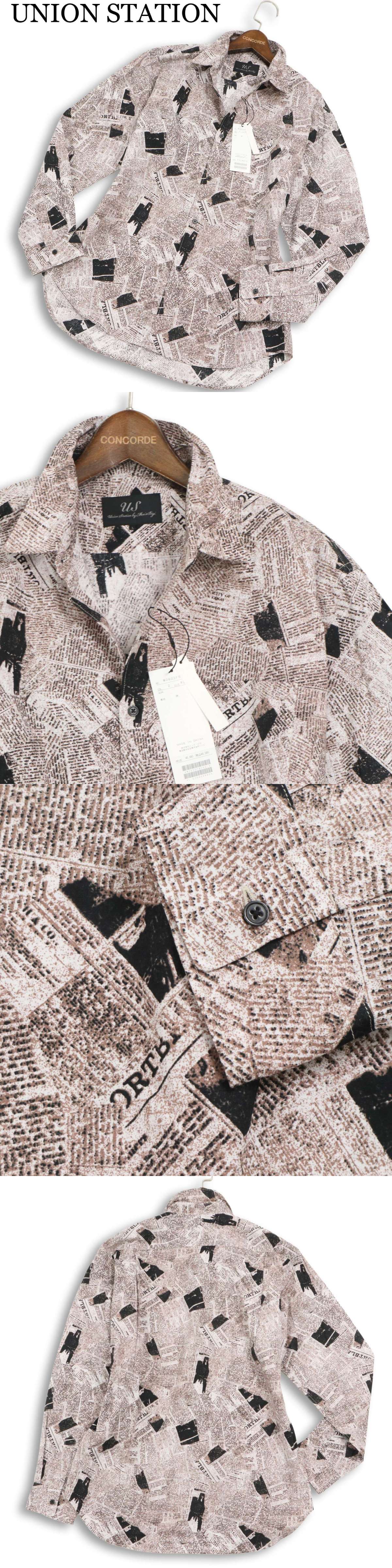 新品 未使用★ UNION STATION ユニオンステーション メンズビギ ニュースペーパー タブロイド 総柄 長袖 シャツ Sz.L メンズ 收藏