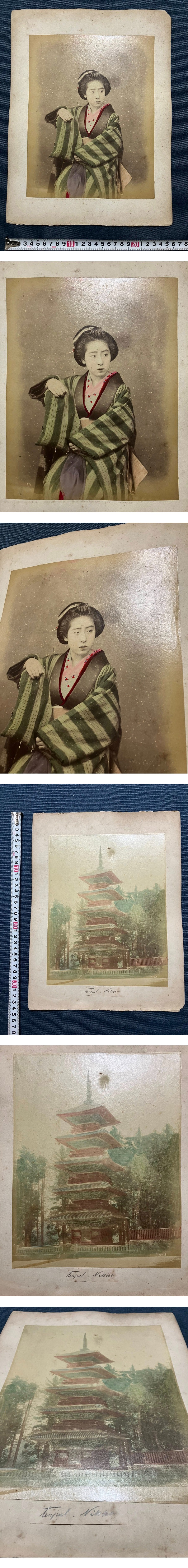 【稀少!】日下部金兵衛写真 大判鶏卵写真「芸者」「日光東照宮・五重塔」両面貼付 幕末・維新期 手彩色 古写真 カラー 写真歴史(2) 收藏