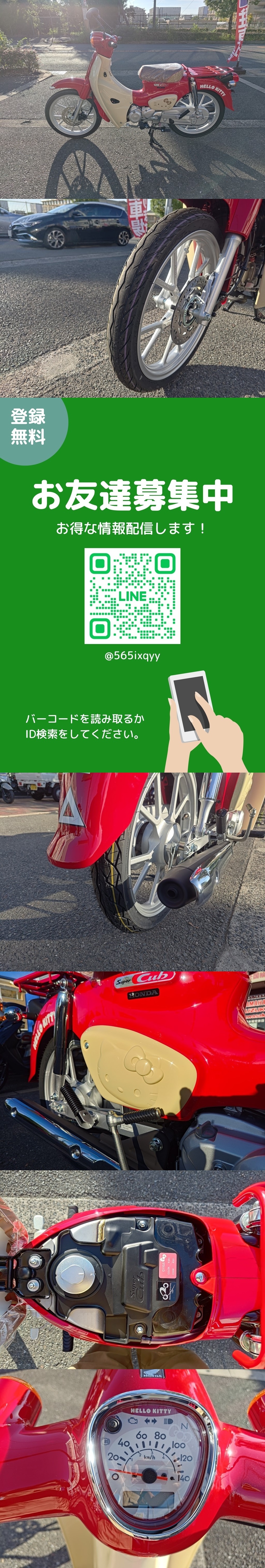 | ホンダ スーパーカブ110<ハローキティ50周年記念モデル>只今即納可能です! この度、ホンダから発売された**スーパーカブ110<ハローキティ50周年記念モデル>**が、ついに入荷しました! 長年愛され続けている国民的バイク、スーパーカブと、同じく世界中で愛されるハローキティ。この夢のようなコラボレーションが、ハローキティ50周年の記念すべき年に実現しました。 このモデルは、キティちゃんの可愛らしさが細部にまでちりばめられた、まさに特別な一台です。フロントににあしらわれたハローキティの**リボンをモチーフにしたエンブレム**や、サイドカウルにあしらわれたキティちゃんの**顔のイラスト**。メーター内にはハローキティのロゴがデザインされており、見るたびに心がときめきます。 受注生産モデルのため、手に入れるのが難しいとされていましたが、今回**1台のみ**特別に入荷しました。まさに早い者勝ちのプレミアムなバイクです。ご自身用にはもちろん、キティちゃんファンの方への特別なプレゼントにも最適です。 バイクとしての性能も、もちろん折り紙付きです。スーパーカブならではの**扱いやすさ**と**燃費の良さ**は、通勤やちょっとしたお買い物、街乗りにもぴったり。さらに、**メーカー保証が2年間**付いているので、安心して乗り始めることができます。 ご来店が難しいお客様のために、**全国各地への陸送**も承っております。また、万が一のときに備える**盗難保険**や**ロードサービス保険**など、各種任意保険のご相談もお任せください。ご購入方法についても、ご自宅にいながらオンラインで受けられる**ローンの審査**をご利用いただけます。 現在お乗りのバイクからの**買い替え**や**下取り**、**買取**も大歓迎です。カスタムのご相談も承っておりますので、自分だけの一台に仕上げることも可能です。 この特別なスーパーカブ110を手に入れるチャンスは今しかありません!詳細は、ぜひお気軽に当店までお問い合わせください。皆さまのご連絡を心よりお待ちしております。 |