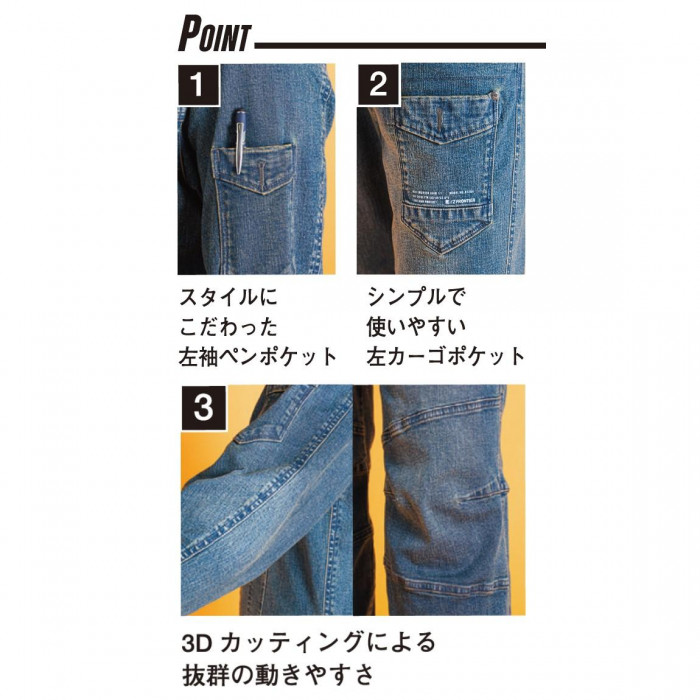 | 年間通じて着用可能な9オンストレッチデニム素材を採用。適度なストレッチ性能が快適な動きやすさを実現します。素材のみならず、絶妙な3Dカッティングにより更なる動きやすさとスタイリッシュなルックスを両立。ヴィンテージライクなクラブ糸を配合した素材感と、リタリングプリントにより、更なるカジュアル感アップを実現。金属ファスナー、ドット釦等は国産YKK製を使用。細部にまで品質に拘っています。 |