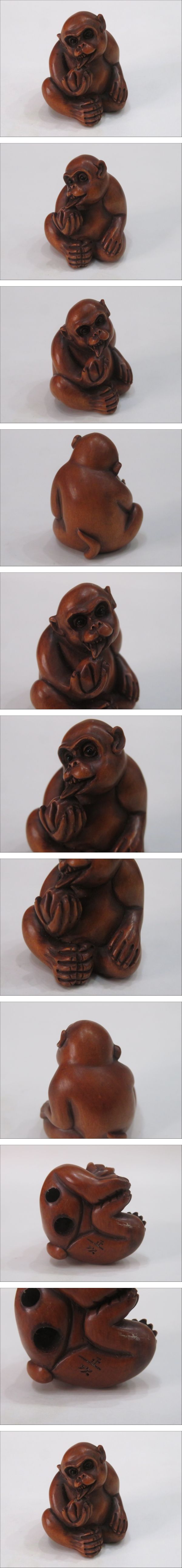 K)根付【桃をなめる猿】在銘・正次◆江戸~明治時代 木彫り 時代物 彫刻 古美術 サル 動物 生き物 検)提げ物緒締め印籠煙草入れ煙管 收藏