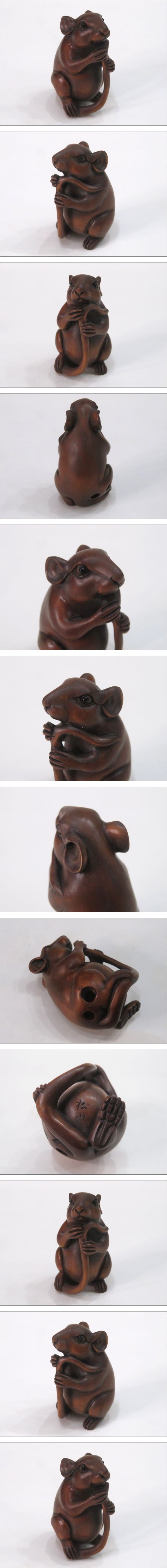 L)根付【尻尾をつかむ鼠】在銘・松山◆江戸~明治時代 木彫り 時代物 彫刻 古美術 ネズミ 動物 生き物 検)提げ物緒締め印籠煙草入れ煙管 收藏