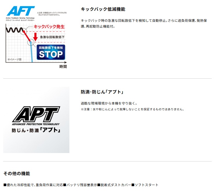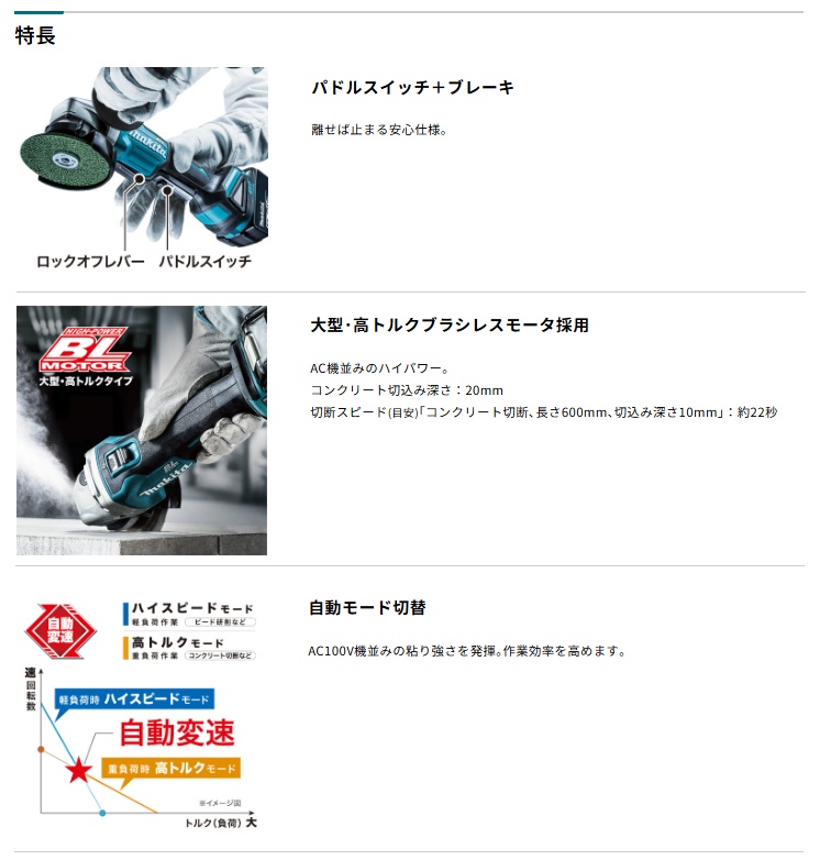電池・充電器はその他機種のセット商品をバラシた商品です。説明書・外箱・ケースは付属しません。マキタ makita充電式ディスクグラインダ/ パドルスイッチタイプGA508DバッテリBL1860B(1個)+充電器DC18WC付当店オリジナルセット品※ケースは付属しません。■パドルスイッチ+ブレーキ離せば止まる安心仕様。■大型・高トルクブラシレスモータ採用AC機並みのハイパワー。コンクリート切込み深さ:20mm■自動モード切替AC100V機並みの粘り強さを発揮。作業効率を高めます。■キックバック低減機能キックバック時の急激な回転数低下を検知して自動停止。さらに過負荷保護、発熱保護、再起動防止機能付。■防滴・防じん「アプト」過酷な現場環境から本機を守り抜く。※注意:水や粉じんによって故障しないことを保証するものではありません。■その他の機能・優れた冷却性能で、重負荷作業に対応・バッテリ残容量表示・脱着式ダストカバー・ソフトスタート88381814522883818903118838146403188381597593008838189031100883814640310088381597593