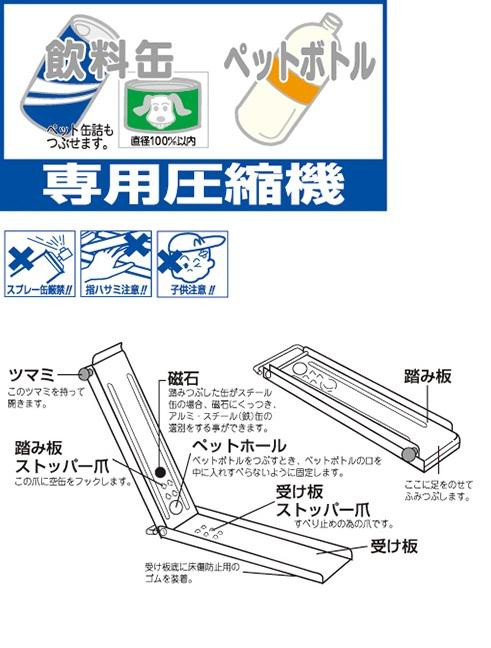 | 飲料用空缶(190mL~1.0Lまで)コンパクトにつぶし、磁石によりアルミとスチール缶を選別することができます。飲料用空ペットボトル(500mL~2.0Lまで)もコンパクトにつぶせます。 |